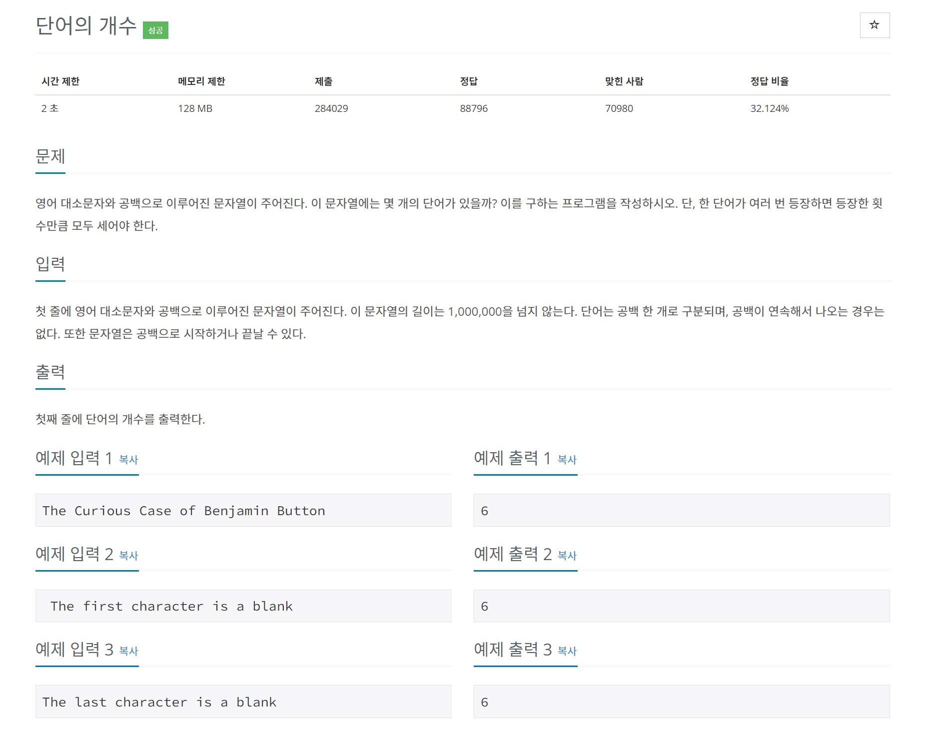 첫 줄에 영어 대소문자와 공백으로 이루어진 문자열이 주어진다. 이 문자열의 길이는 1,000,000을 넘지 않는다. 단어는 공백 한 개로 구분되며, 공백이 연속해서 나오는 경우는 없다. 또한 문자열