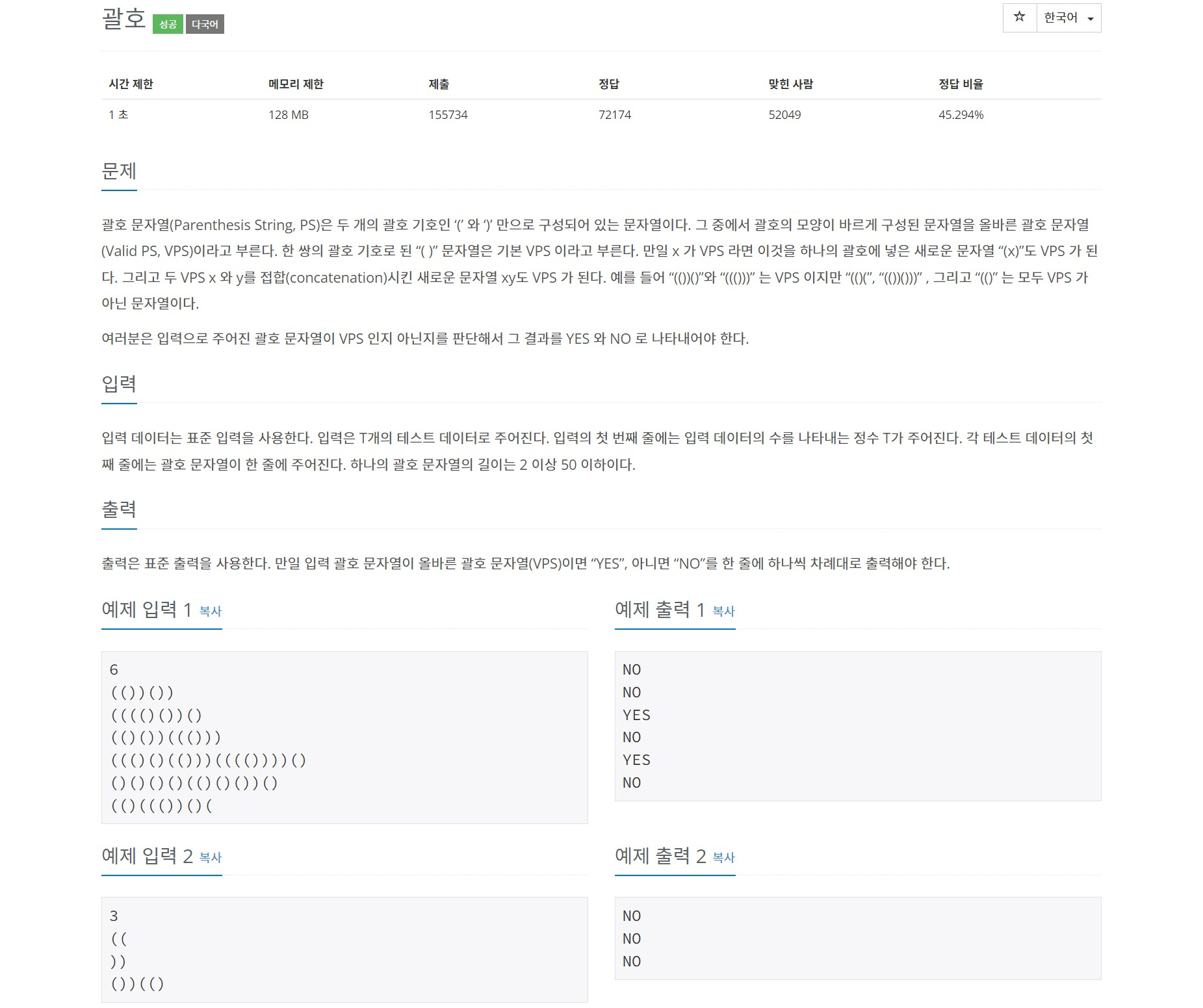괄호 문자열(Parenthesis String, PS)은 두 개의 괄호 기호인 ‘(’ 와 ‘)’ 만으로 구성되어 있는 문자열이다. 그 중에서 괄호의 모양이 바르게 구성된 문자열을 올바른 괄호 문자열(Valid PS, VPS)이라고