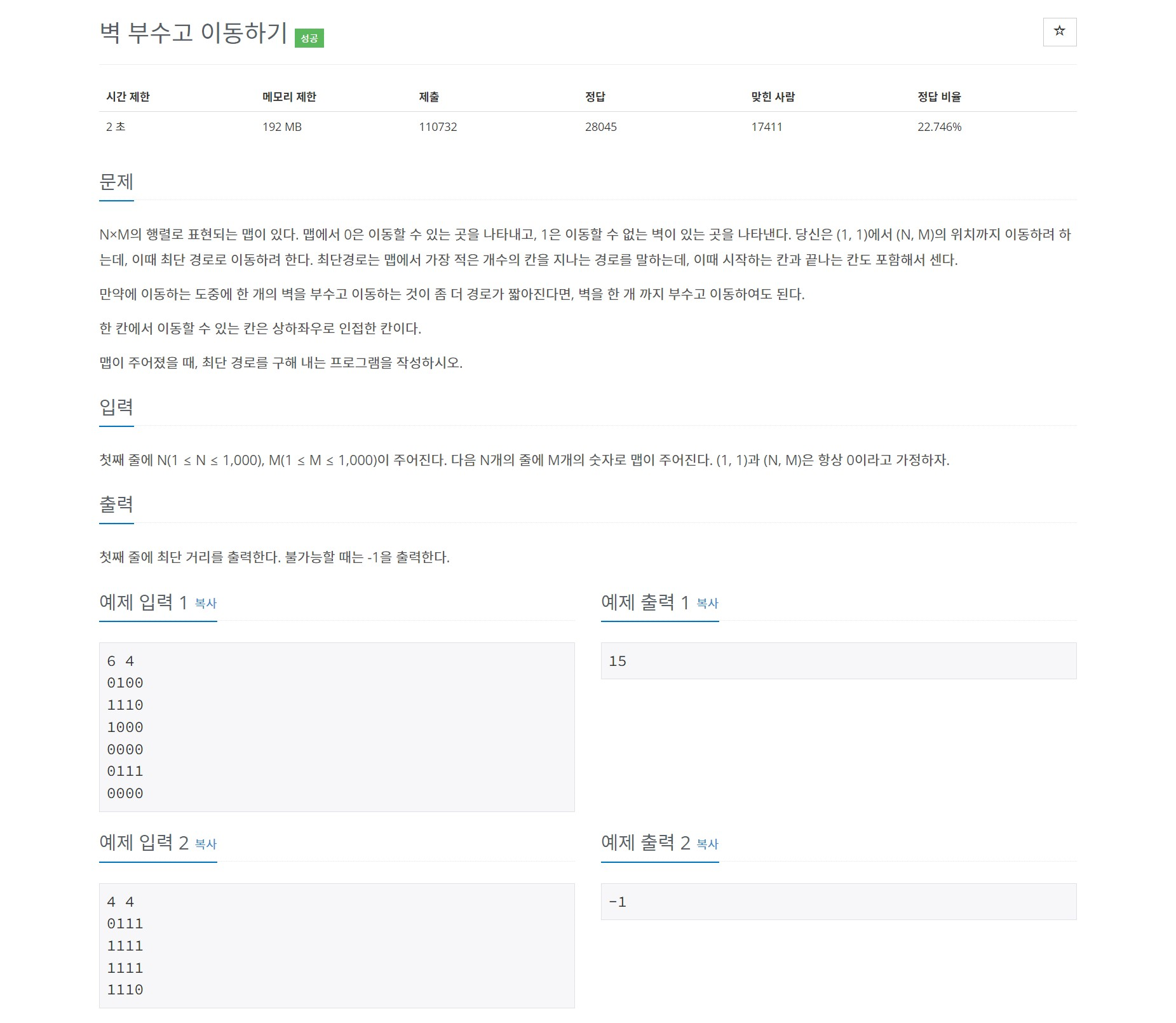 N×M의 행렬로 표현되는 맵이 있다. 맵에서 0은 이동할 수 있는 곳을 나타내고, 1은 이동할 수 없는 벽이 있는 곳을 나타낸다. 당신은 (1, 1)에서 (N, M)의 위치까지 이동하려 하는데, 이때 최단 경로