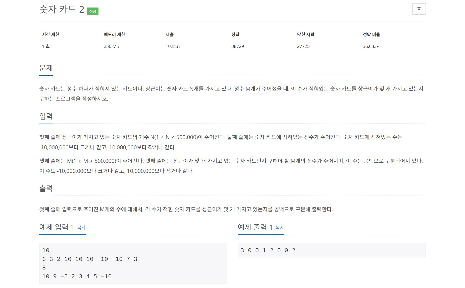 첫째 줄에 상근이가 가지고 있는 숫자 카드의 개수 N(1 ≤ N ≤ 500,000)이 주어진다. 둘째 줄에는 숫자 카드에 적혀있는 정수가 주어진다. 숫자 카드에 적혀있는 수는 -10,000,000보다 크거나 같고, 10,