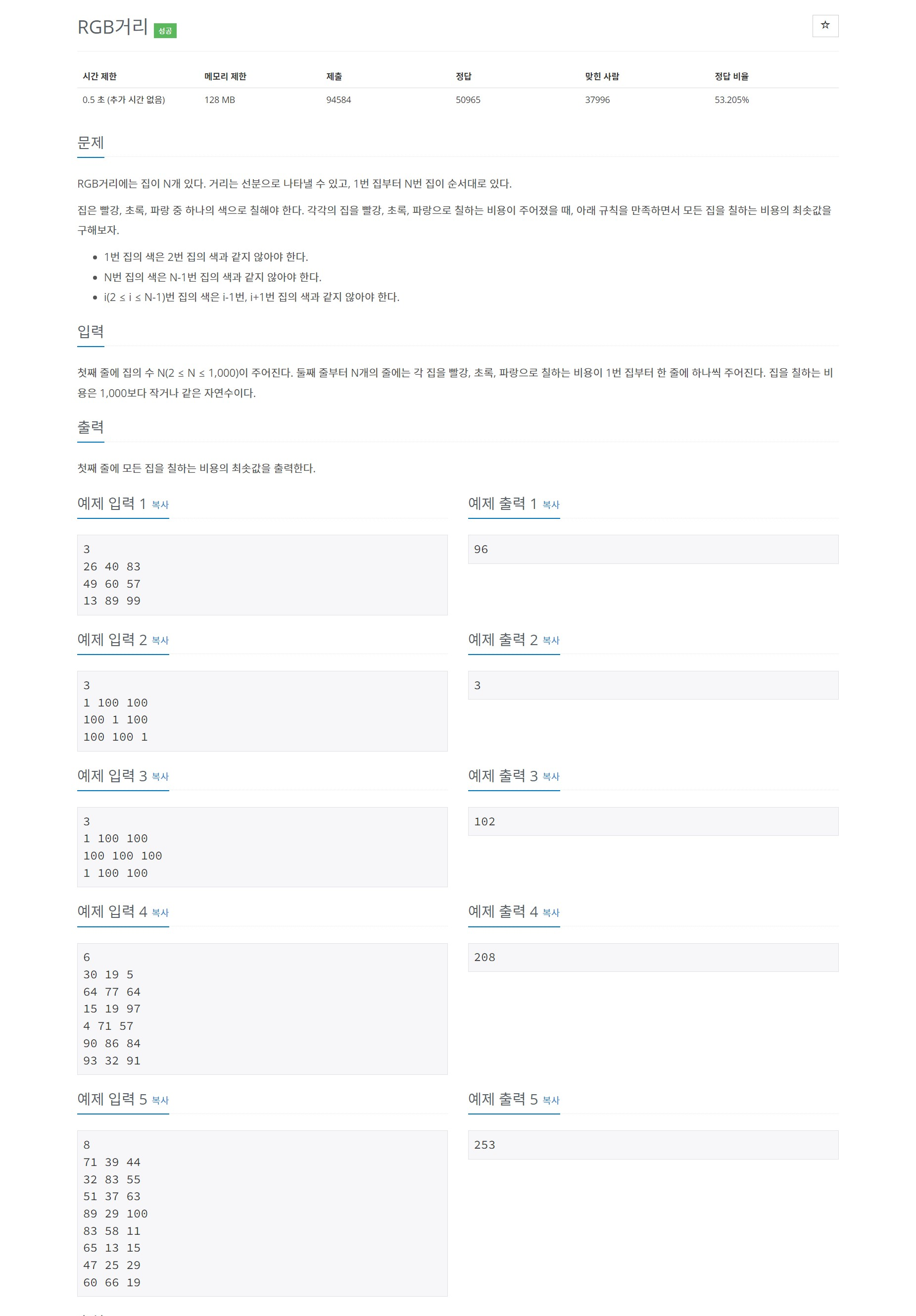 첫째 줄에 집의 수 N(2 ≤ N ≤ 1,000)이 주어진다. 둘째 줄부터 N개의 줄에는 각 집을 빨강, 초록, 파랑으로 칠하는 비용이 1번 집부터 한 줄에 하나씩 주어진다. 집을 칠하는 비용은 1,000보다 작거나