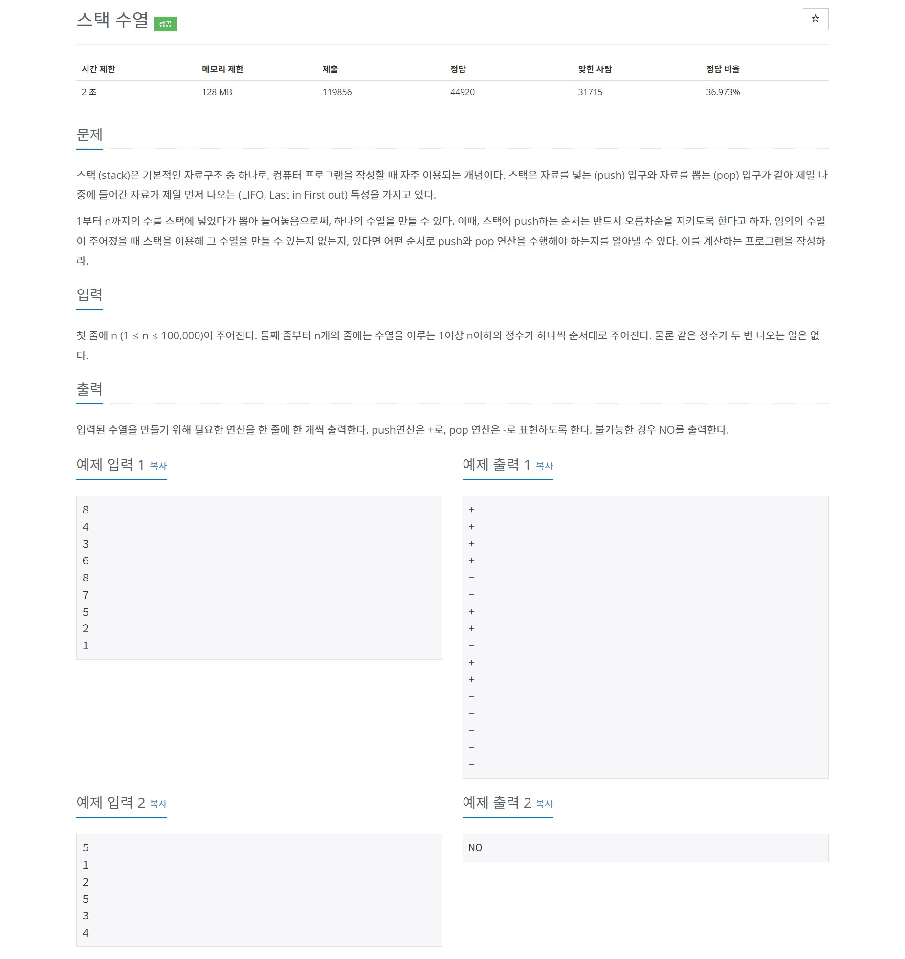 1부터 n까지에 수에 대해 차례로 [push, push, push, push, pop, pop, push, push, pop, push, push, pop, pop, pop, pop, pop] 연산을 수행하면 수열 [4, 3, 6, 8, 7, 5, 2, 1]을 얻을 수 있다.