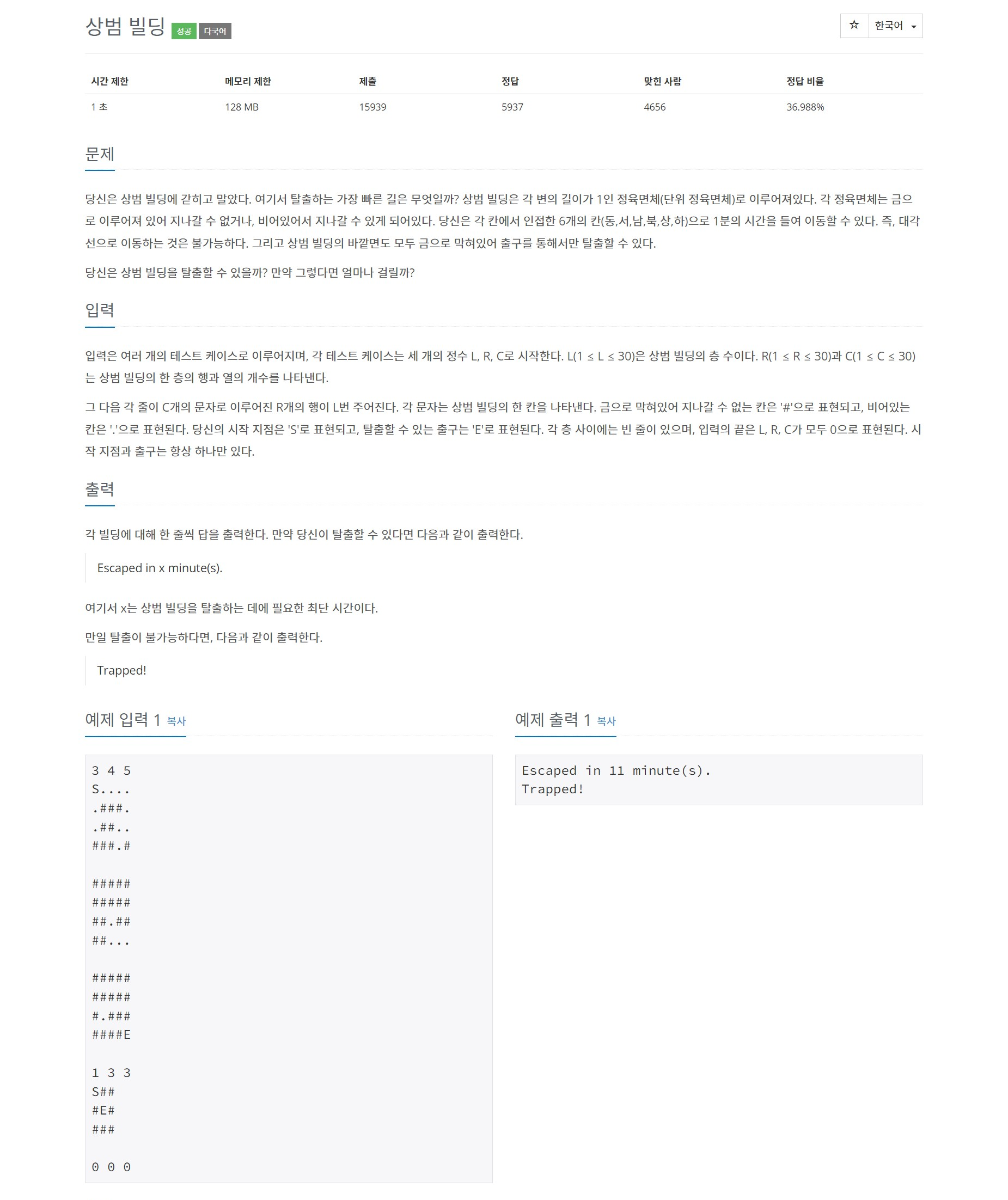 당신은 상범 빌딩에 갇히고 말았다. 여기서 탈출하는 가장 빠른 길은 무엇일까? 상범 빌딩은 각 변의 길이가 1인 정육면체(단위 정육면체)로 이루어져있다. 각 정육면체는 금으로 이루어져 있어