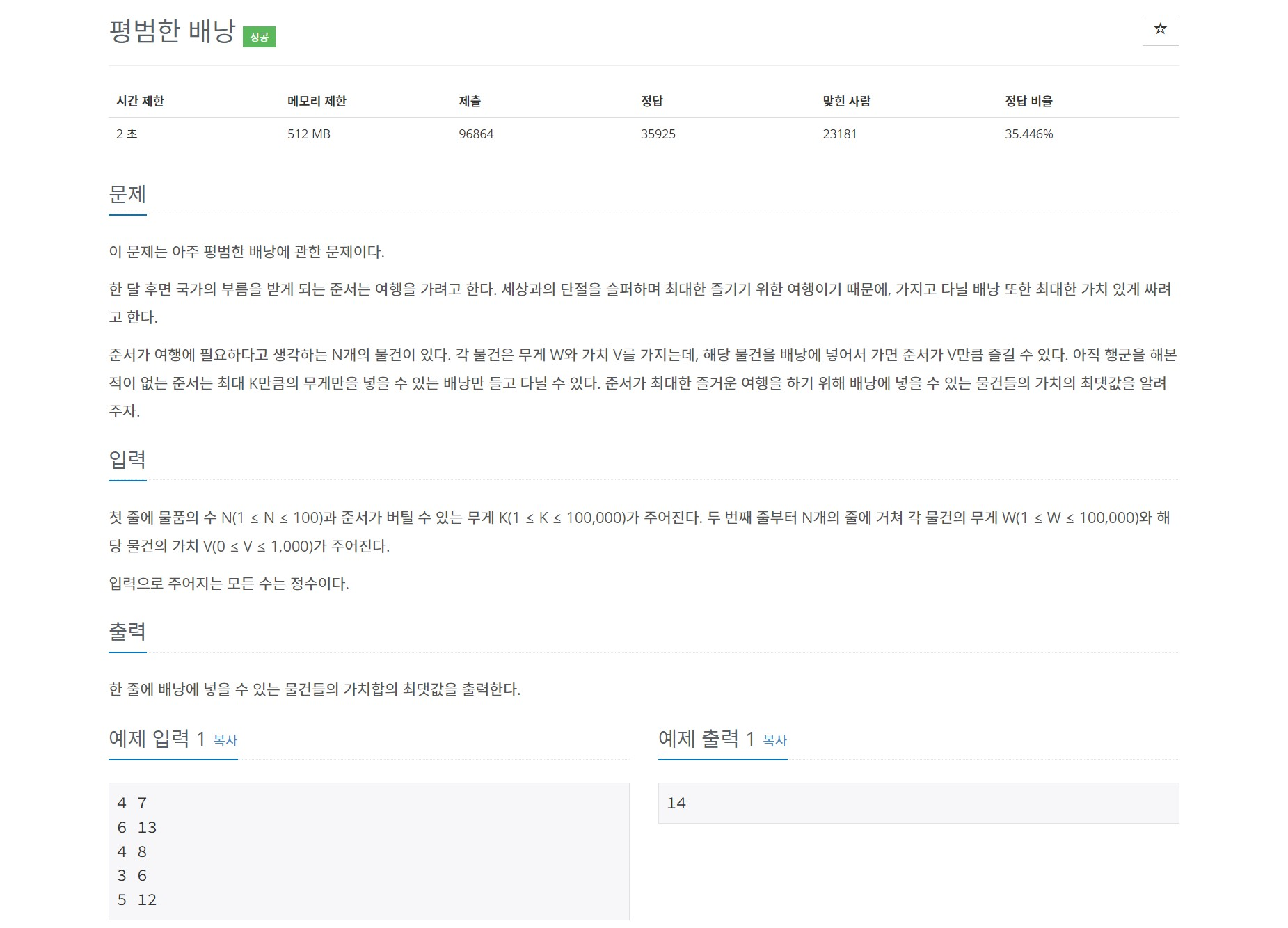 첫 줄에 물품의 수 N(1 ≤ N ≤ 100)과 준서가 버틸 수 있는 무게 K(1 ≤ K ≤ 100,000)가 주어진다. 두 번째 줄부터 N개의 줄에 거쳐 각 물건의 무게 W(1 ≤ W ≤ 100,000)와 해당 물건의 가치 V(0 ≤ V ≤ 1,000)