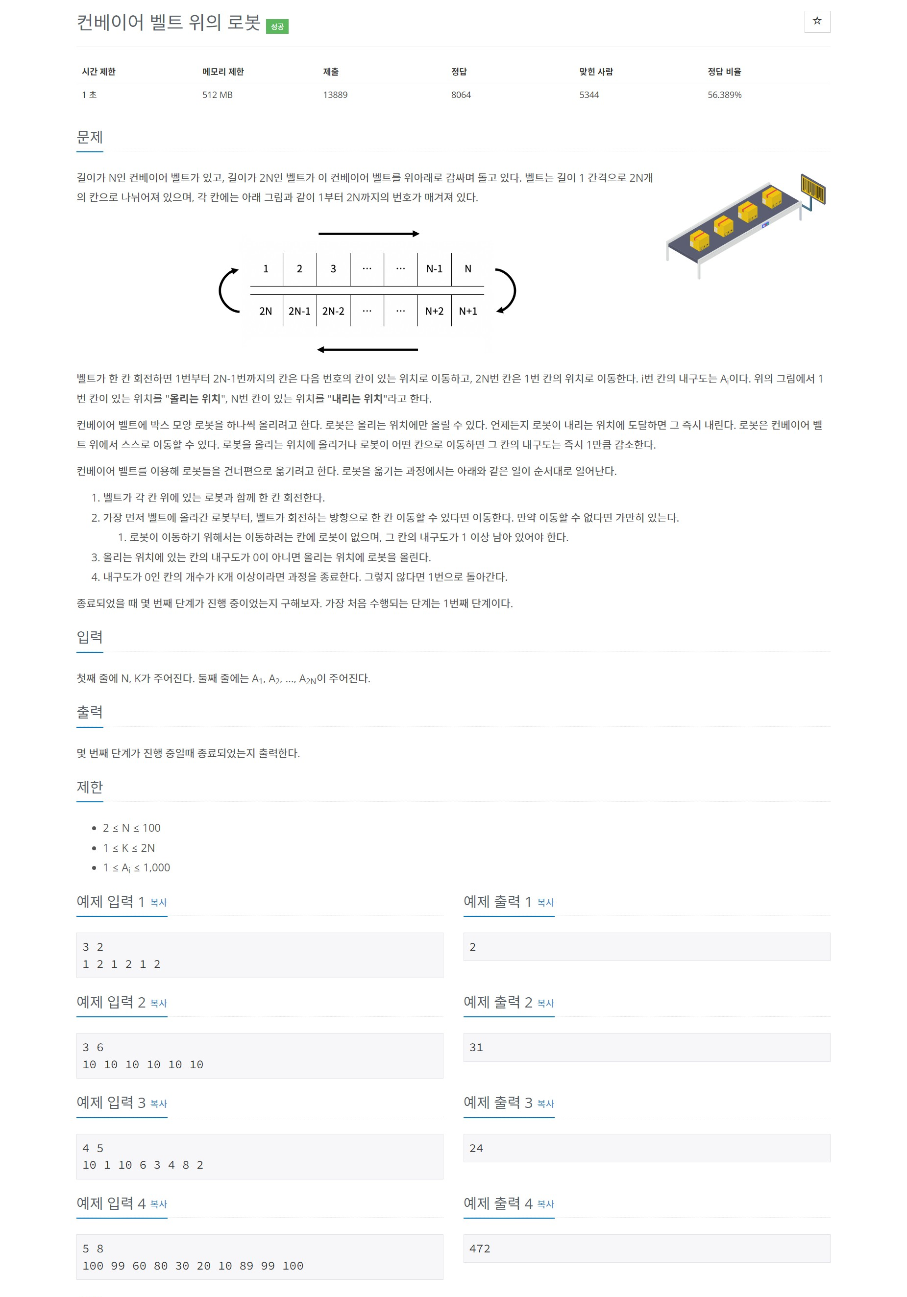 길이가 N인 컨베이어 벨트가 있고, 길이가 2N인 벨트가 이 컨베이어 벨트를 위아래로 감싸며 돌고 있다. 벨트는 길이 1 간격으로 2N개의 칸으로 나뉘어져 있으며, 각 칸에는 아래 그림과 같이 1부