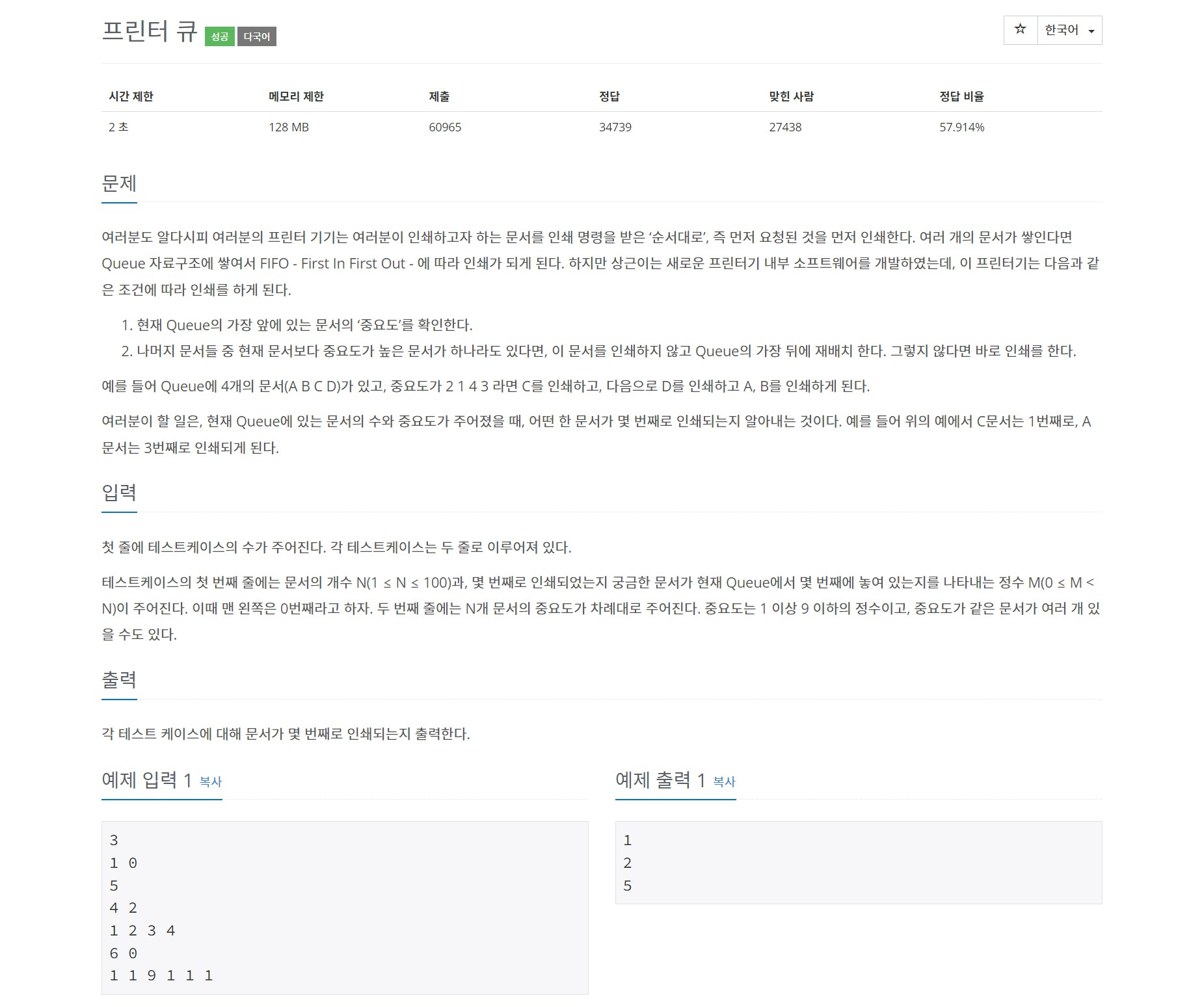 큐에서 하나씩 빼면서 중요도가 가장 높은 문서가 아니라면 다시 큐에 넣는다.