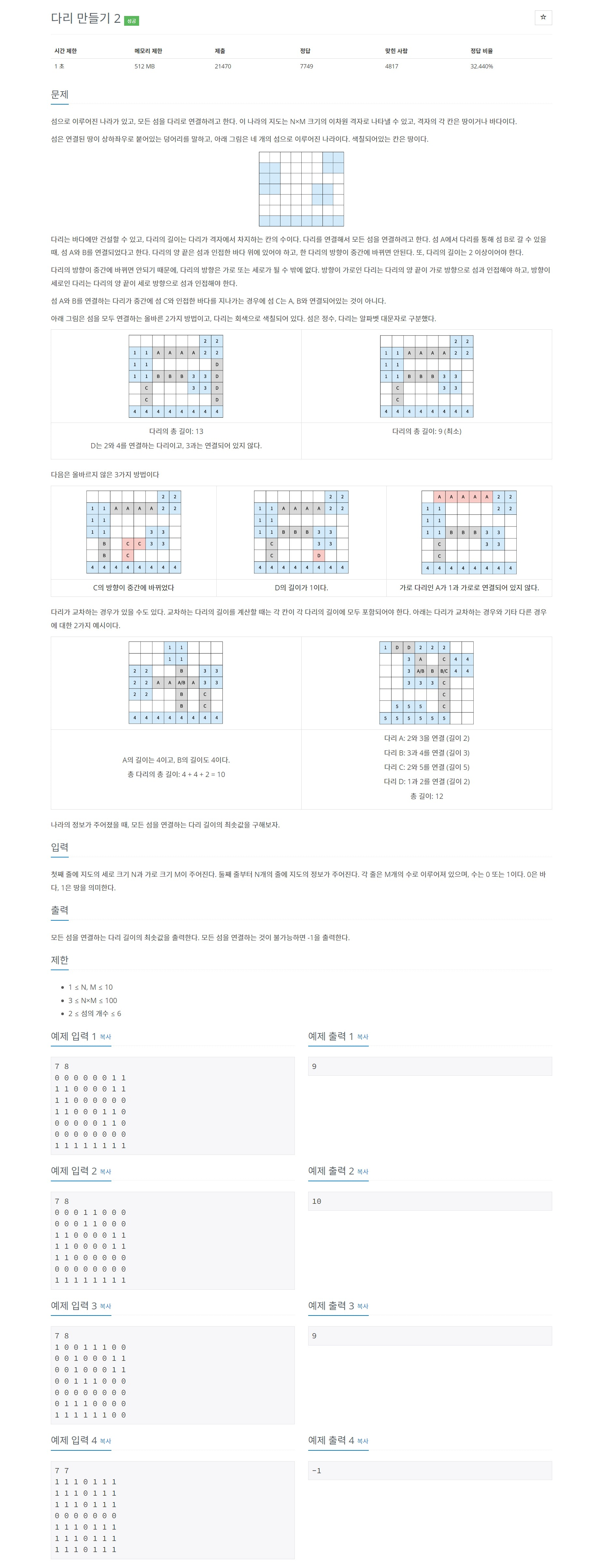 섬 사이 거리는 dfs를 이용해 다른 섬이 나올 때까지 한다. 그 거리 중 1이 아닌 최소 거리를 저장한다.
