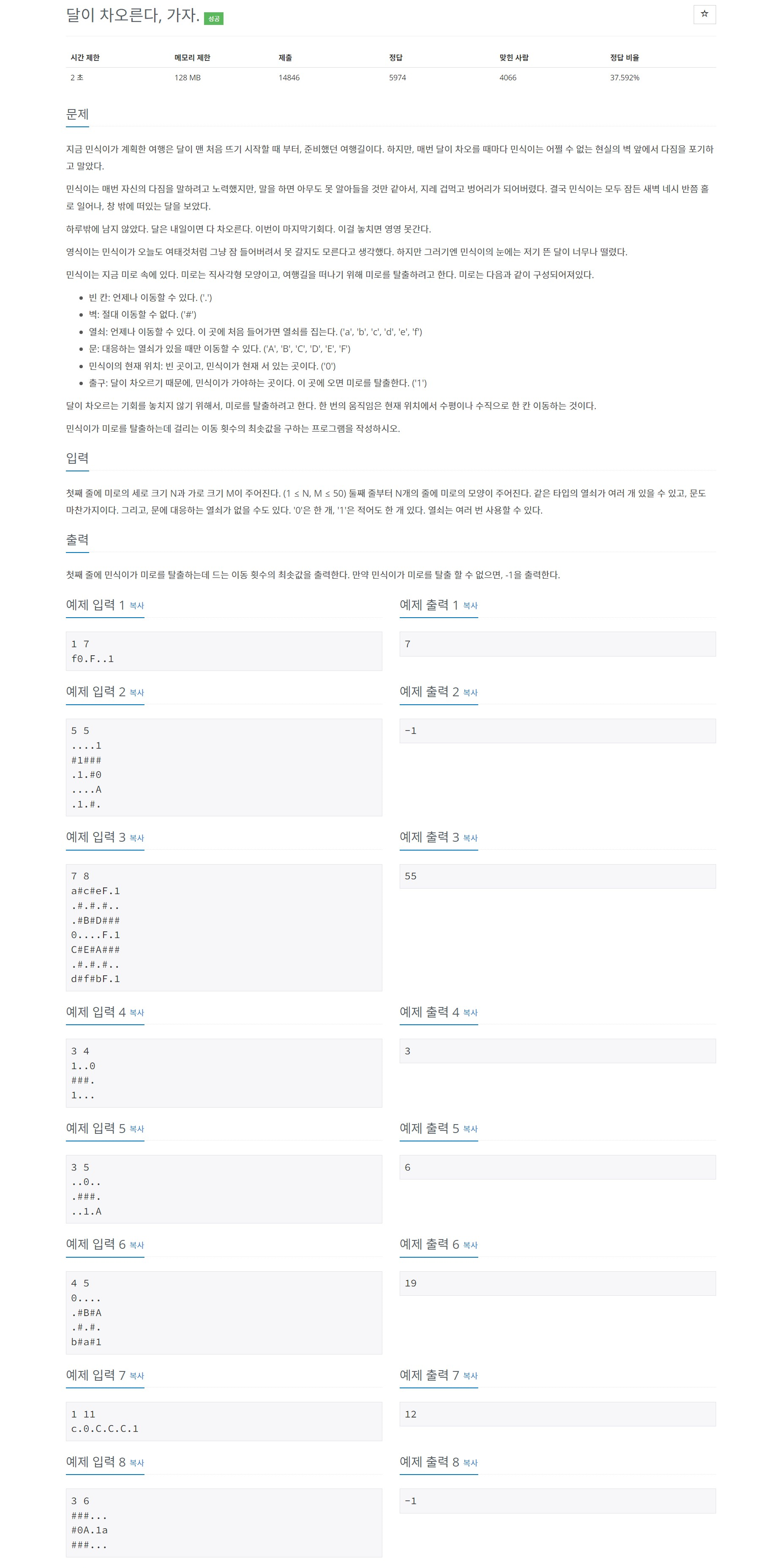 첫째 줄에 미로의 세로 크기 N과 가로 크기 M이 주어진다. (1 ≤ N, M ≤ 50) 둘째 줄부터 N개의 줄에 미로의 모양이 주어진다. 같은 타입의 열쇠가 여러 개 있을 수 있고, 문도 마찬가지이다. 그리고,