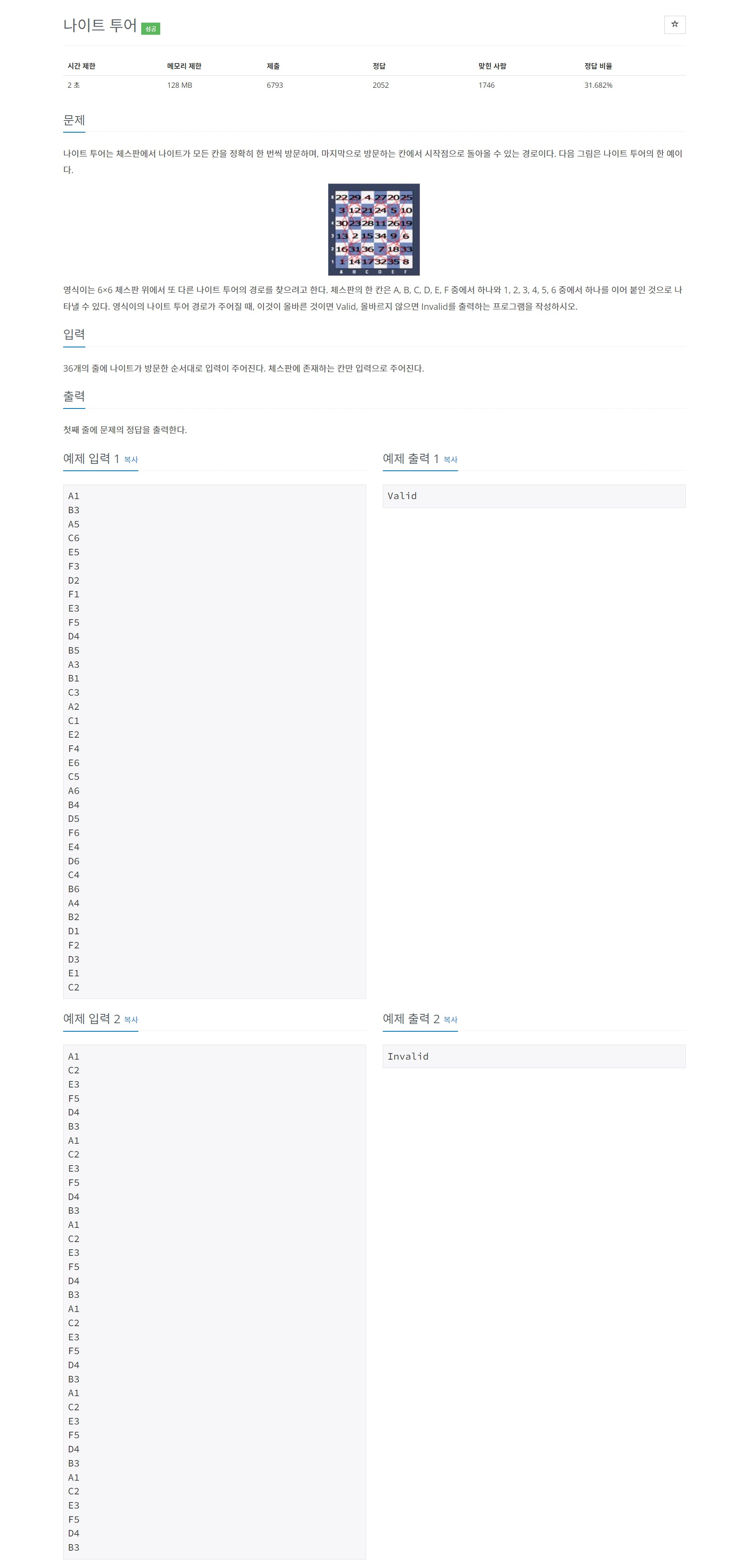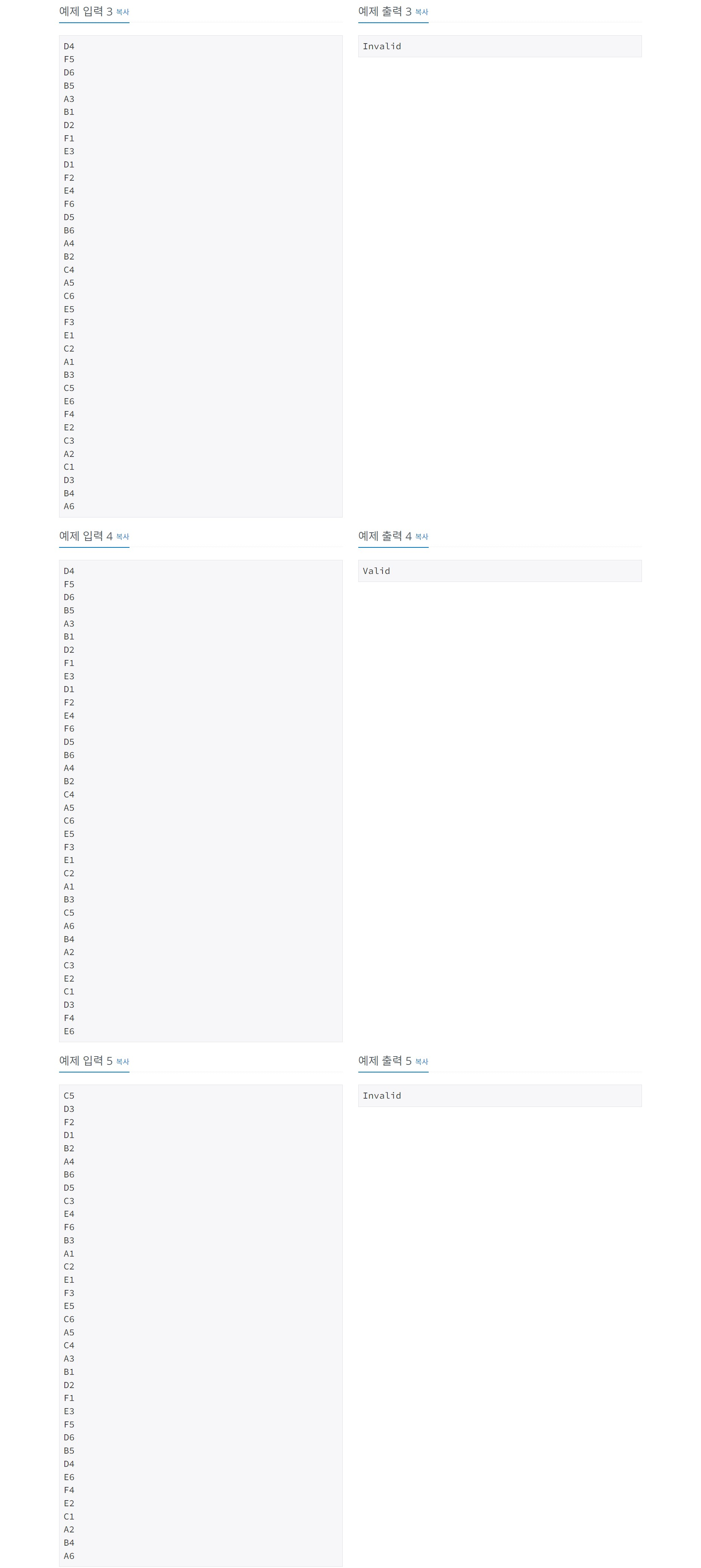 나이트의 이동 범위인지 확인하는 과정이 필요하다. 전에 있던 좌표와 x축 절댓값 차이가 2이면서 y축 절댓값 차이가 1인 경우거나 x축 절댓값 차이가 1이면서 y축 절댓값 차이가 2인 경우인지 판단한다. 또한 방문했던 좌표인지 확인하는 과정도 필요하다. 그 과정에서 flag가 바뀌었는지 판단해서 "Valid" 또는 "Invalid"를 출력한다.