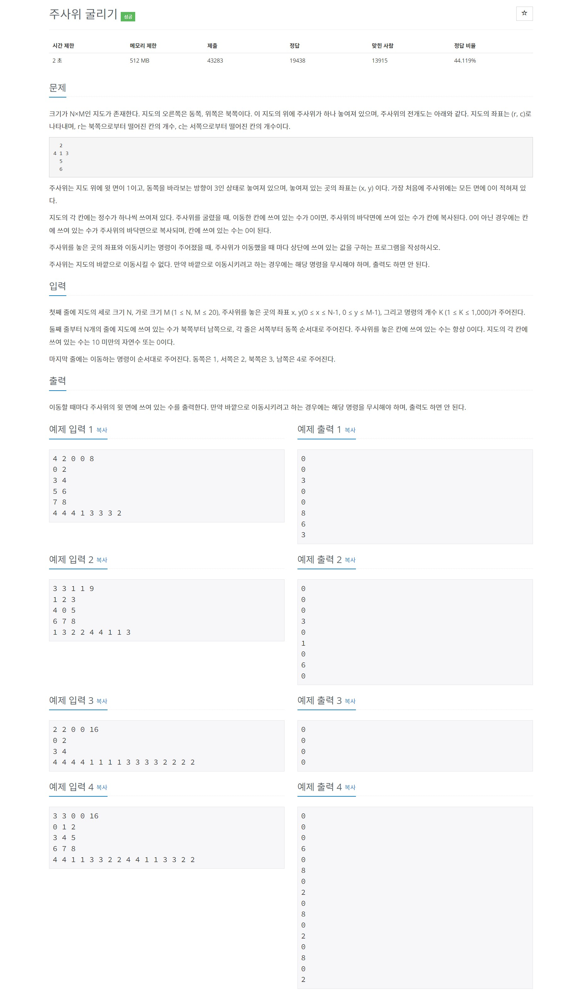첫째 줄에 지도의 세로 크기 N, 가로 크기 M (1 ≤ N, M ≤ 20), 주사위를 놓은 곳의 좌표 x, y(0 ≤ x ≤ N-1, 0 ≤ y ≤ M-1), 그리고 명령의 개수 K (1 ≤ K ≤ 1,000)가 주어진다. 둘째 줄부터 N개의 줄에 지