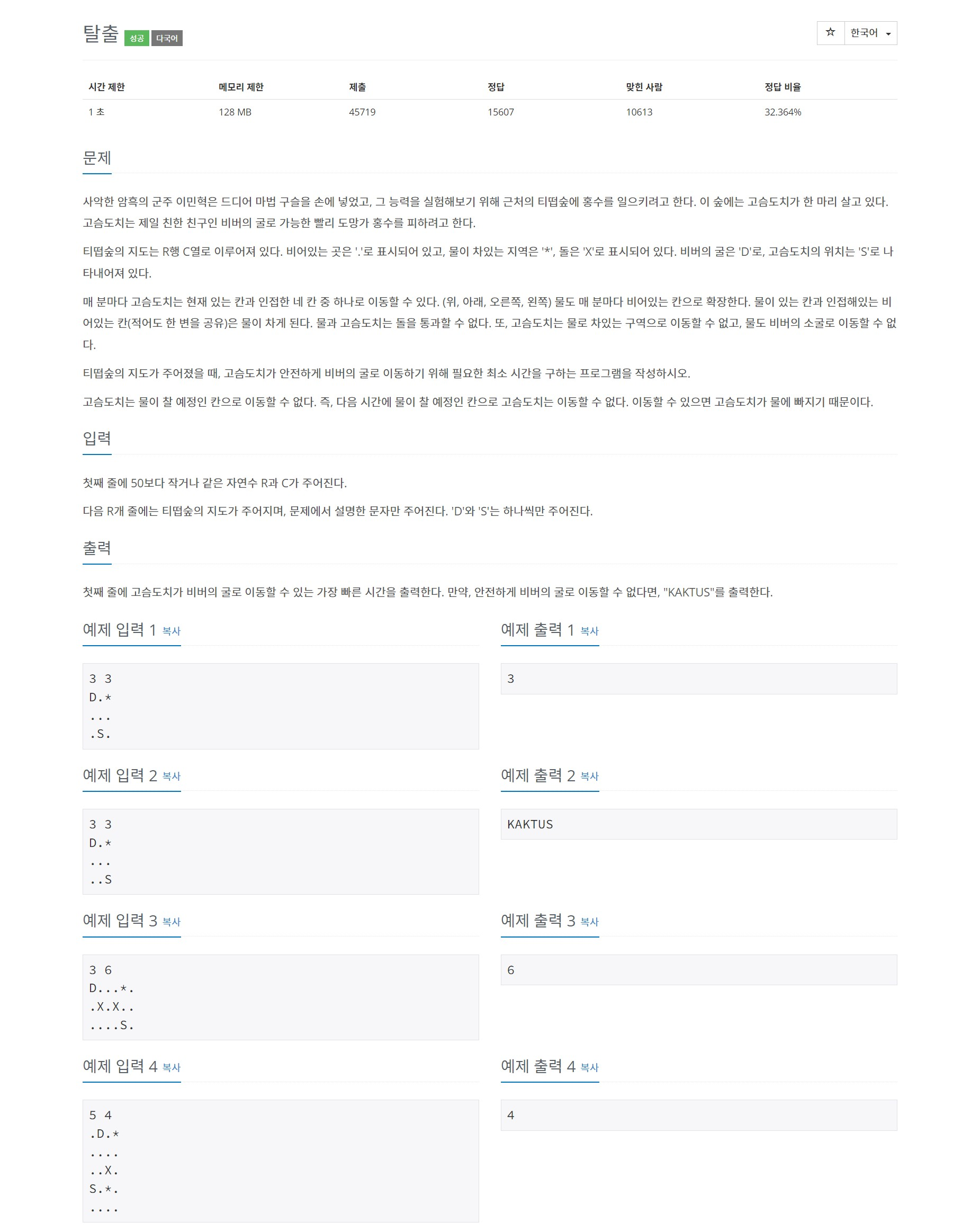 고슴도치는 물이 찰 예정인 곳으로 갈 수 없기 때문에 먼저 물을 채우는 방향으로 진행했다.