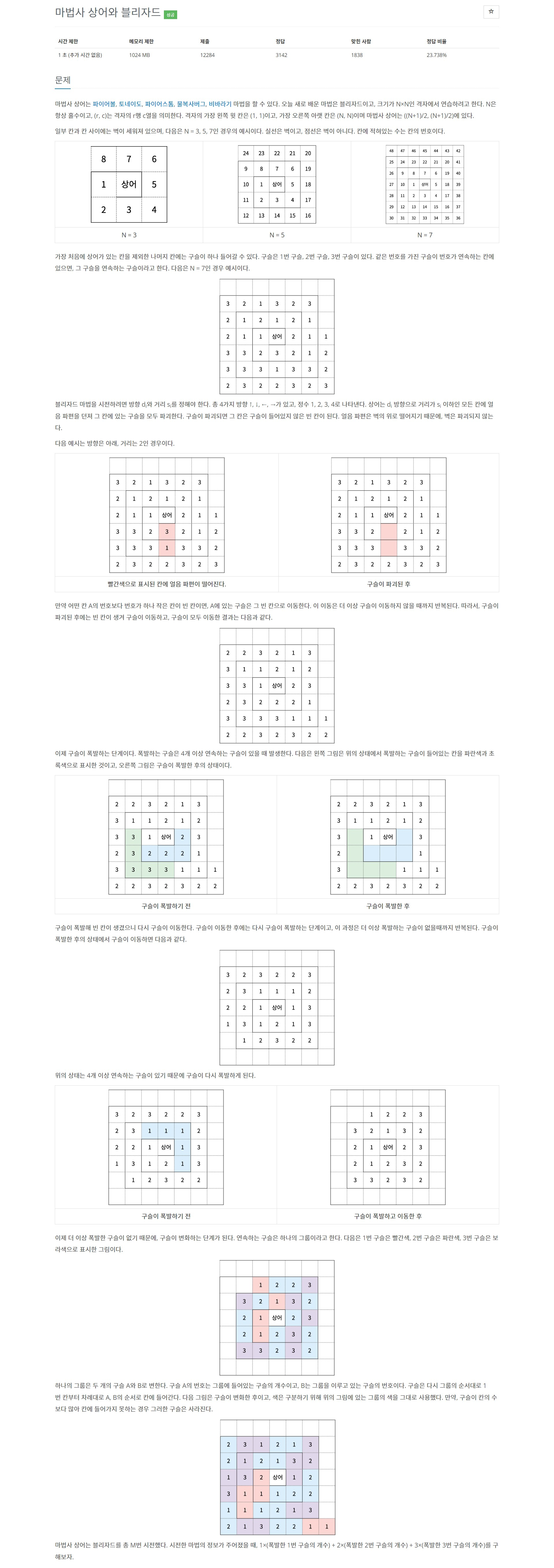 마법사 상어는 파이어볼, 토네이도, 파이어스톰, 물복사버그, 비바라기 마법을 할 수 있다. 오늘 새로 배운 마법은 블리자드이고, 크기가 N×N인 격자에서 연습하려고 한다. N은 항상 홀수이고, (