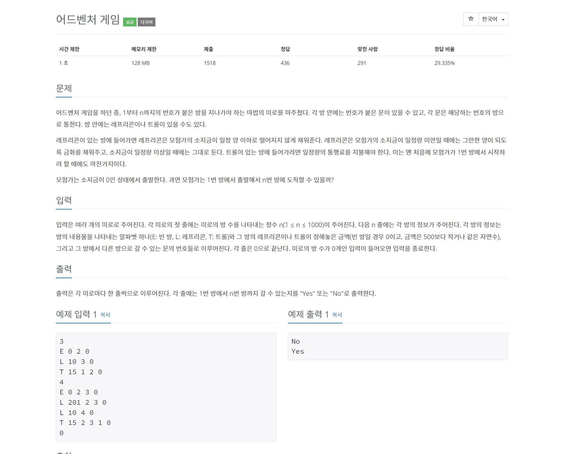 2310번: 어드벤처 게임