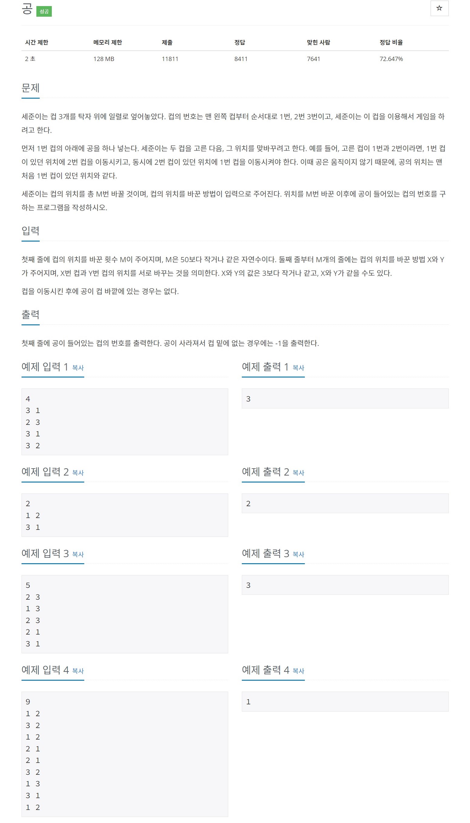 첫째 줄에 컵의 위치를 바꾼 횟수 M이 주어지며, M은 50보다 작거나 같은 자연수이다. 둘째 줄부터 M개의 줄에는 컵의 위치를 바꾼 방법 X와 Y가 주어지며, X번 컵과 Y번 컵의 위치를 서로 바꾸는 것
