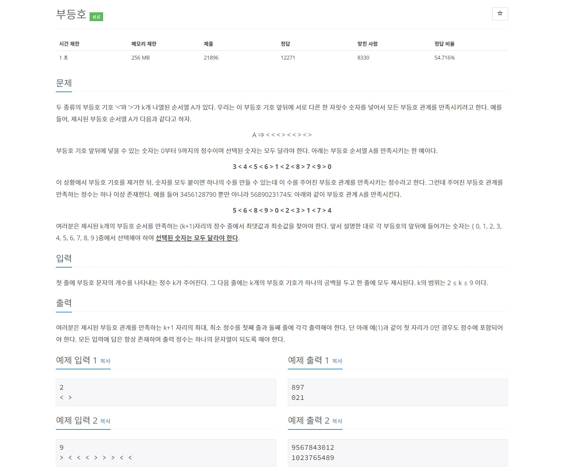 여러분은 제시된 부등호 관계를 만족하는 k+1 자리의 최대, 최소 정수를 첫째 줄과 둘째 줄에 각각 출력해야 한다. 단 아래 예(1)과 같이 첫 자리가 0인 경우도 정수에 포함되어야 한다. 모든 입력