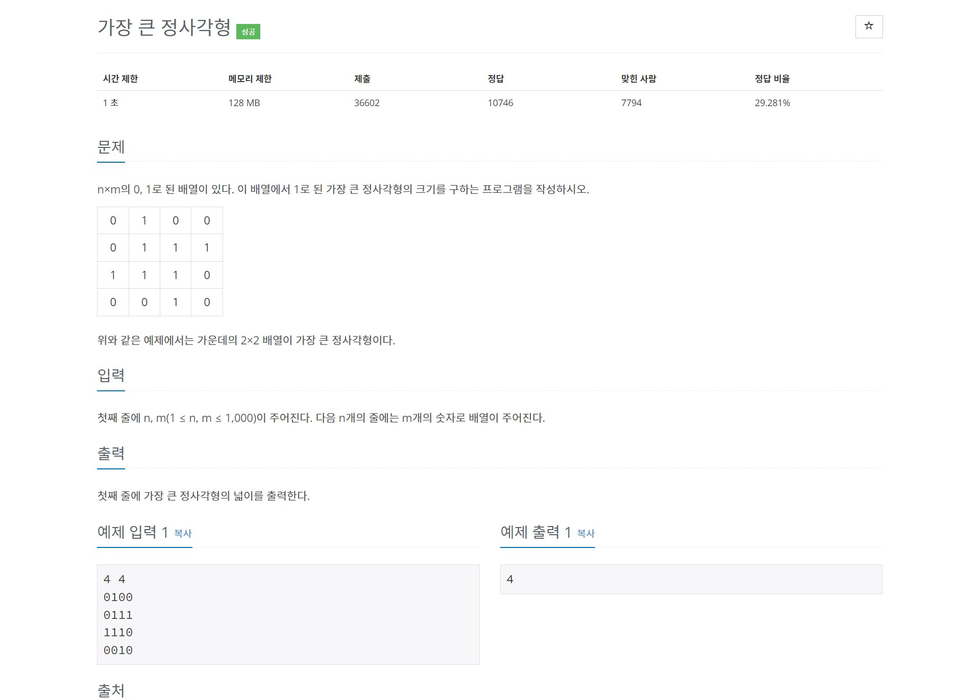 - 0이 나오면 해당위치에서 (-1, 0), (-1, -1), (0, -1)의 dp 중 최솟값을 선택하고 1을 더한 값으로 저장한다.