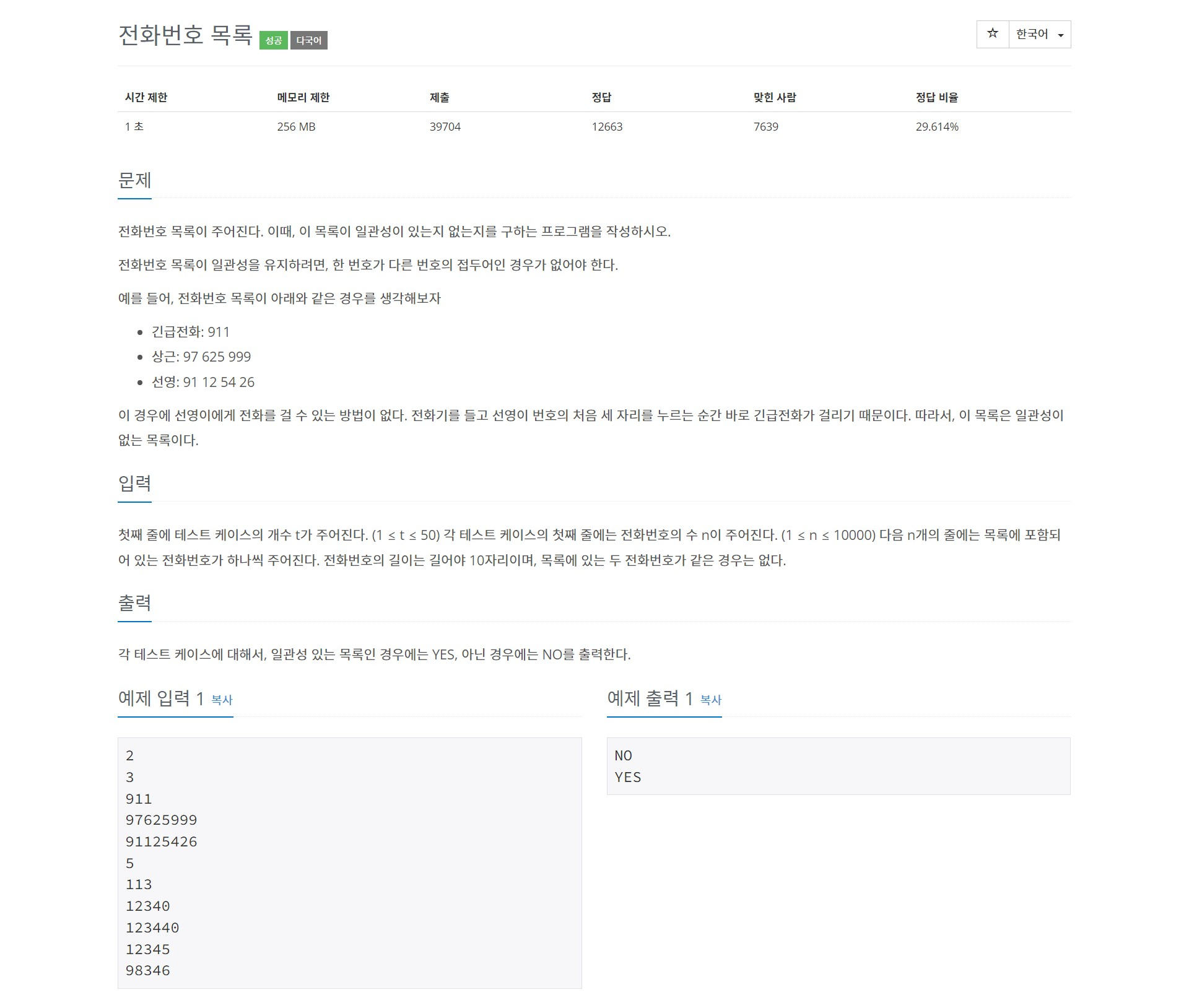 첫째 줄에 테스트 케이스의 개수 t가 주어진다. (1 ≤ t ≤ 50) 각 테스트 케이스의 첫째 줄에는 전화번호의 수 n이 주어진다. (1 ≤ n ≤ 10000) 다음 n개의 줄에는 목록에 포함되어 있는 전화번호가