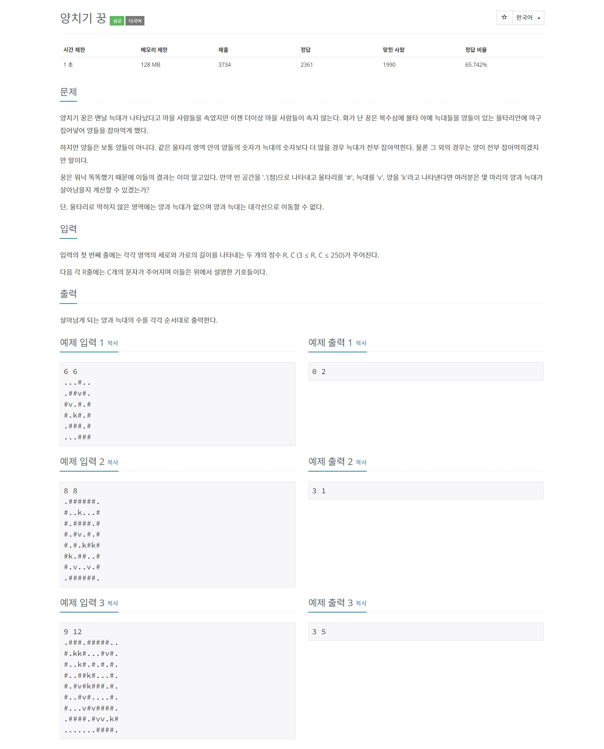 모든 곳을 돌면서 방문하지 않은 곳 중 양이나 늑대가 있는 곳에서 양의 수와 늑대의 수를 0으로 초기화하고 BFS 탐색을 한다.