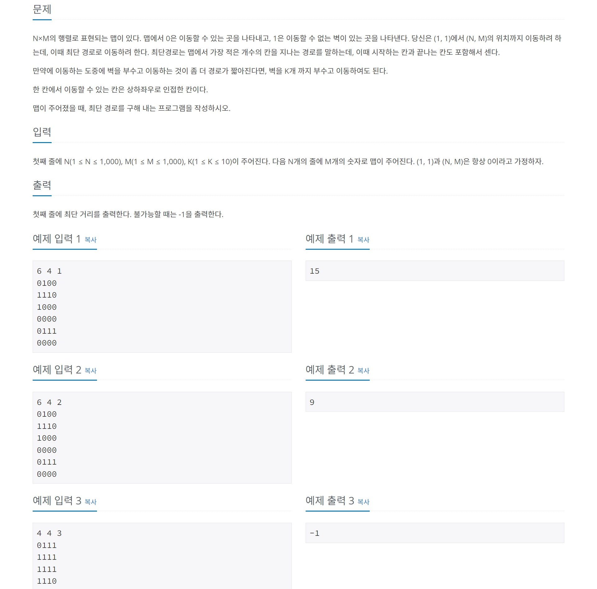 첫째 줄에 N(1 ≤ N ≤ 1,000), M(1 ≤ M ≤ 1,000), K(1 ≤ K ≤ 10)이 주어진다. 다음 N개의 줄에 M개의 숫자로 맵이 주어진다. (1, 1)과 (N, M)은 항상 0이라고 가정하자.