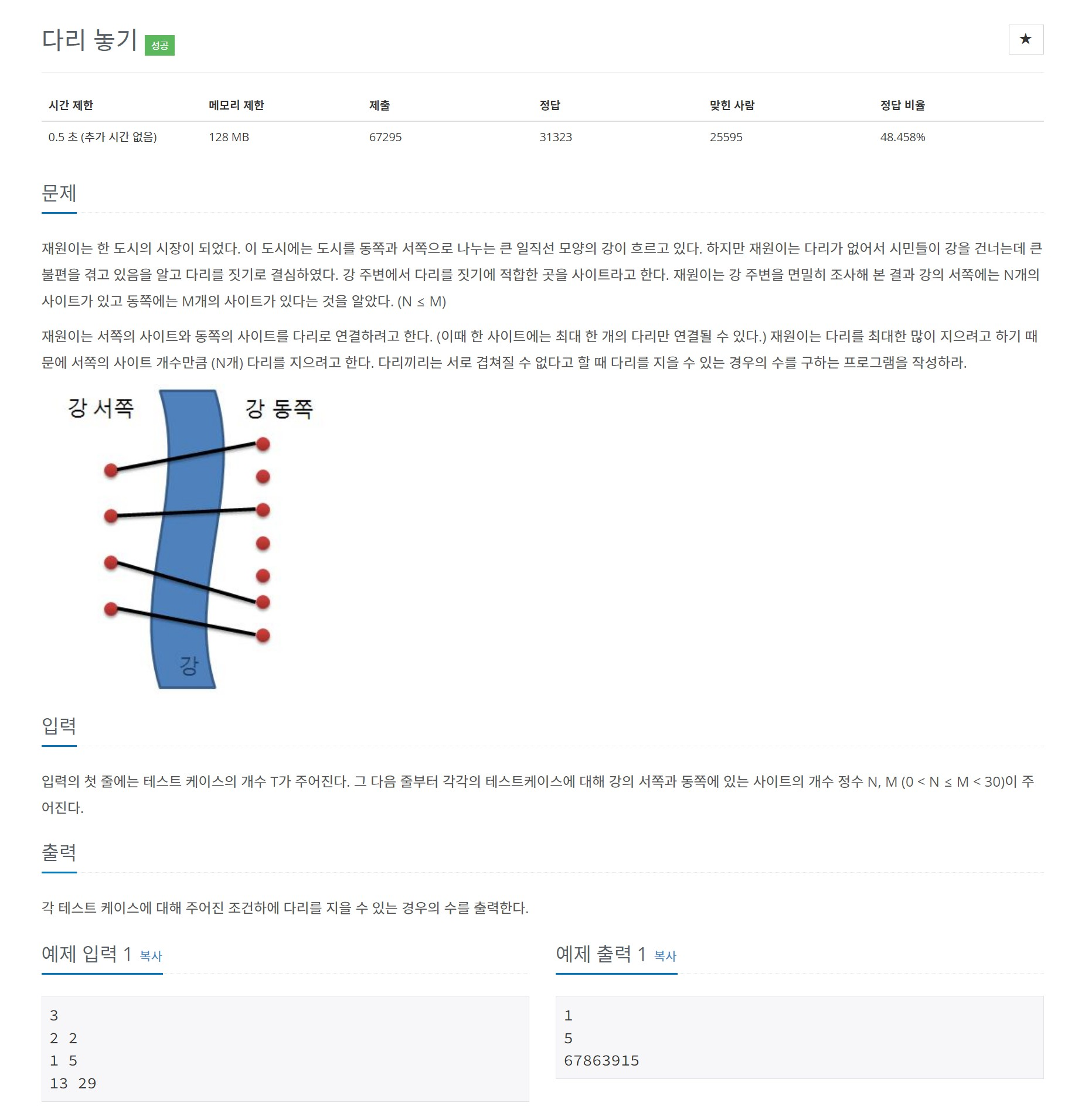 조합 문제로 N<=M이기 때문에 mCn을 구하면 된다.