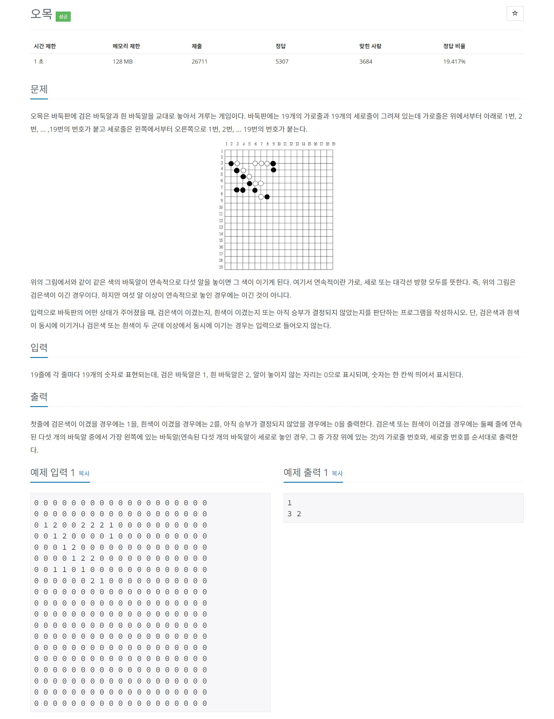 오목은 바둑판에 검은 바둑알과 흰 바둑알을 교대로 놓아서 겨루는 게임이다. 바둑판에는 19개의 가로줄과 19개의 세로줄이 그려져 있는데 가로줄은 위에서부터 아래로 1번, 2번, ... ,19번의 번호