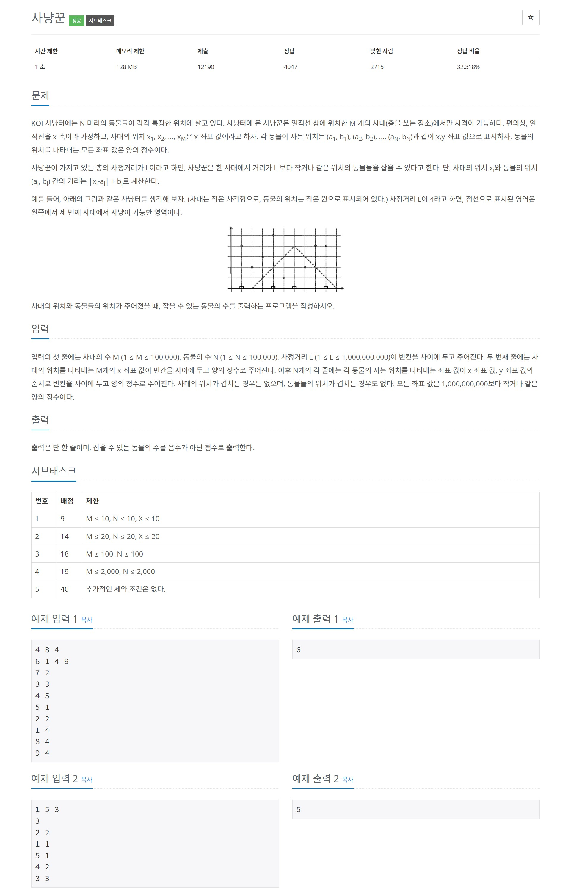 입력의 첫 줄에는 사대의 수 M (1 ≤ M ≤ 100,000), 동물의 수 N (1 ≤ N ≤ 100,000), 사정거리 L (1 ≤ L ≤ 1,000,000,000)이 빈칸을 사이에 두고 주어진다. 두 번째 줄에는 사대의 위치를 나타내는 M개의 x-좌