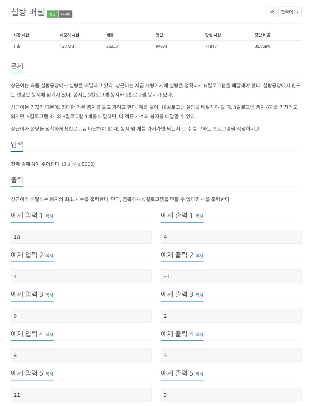 상근이는 요즘 설탕공장에서 설탕을 배달하고 있다. 상근이는 지금 사탕가게에 설탕을 정확하게 N킬로그램을 배달해야 한다. 설탕공장에서 만드는 설탕은 봉지에 담겨져 있다. 봉지는 3킬로그