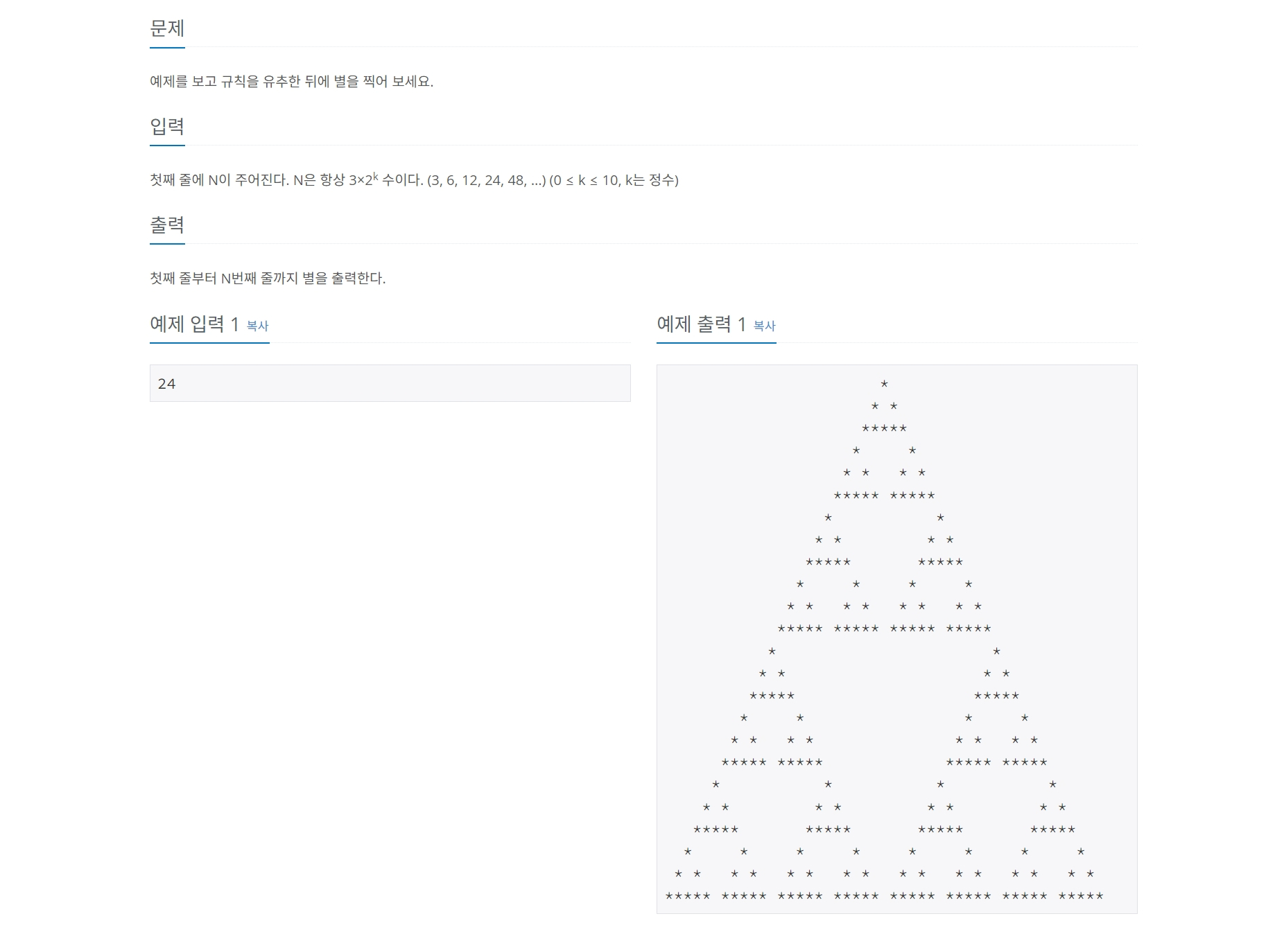 첫째 줄에 N이 주어진다. N은 항상 3×2k 수이다. (3, 6, 12, 24, 48, ...) (0 ≤ k ≤ 10, k는 정수)