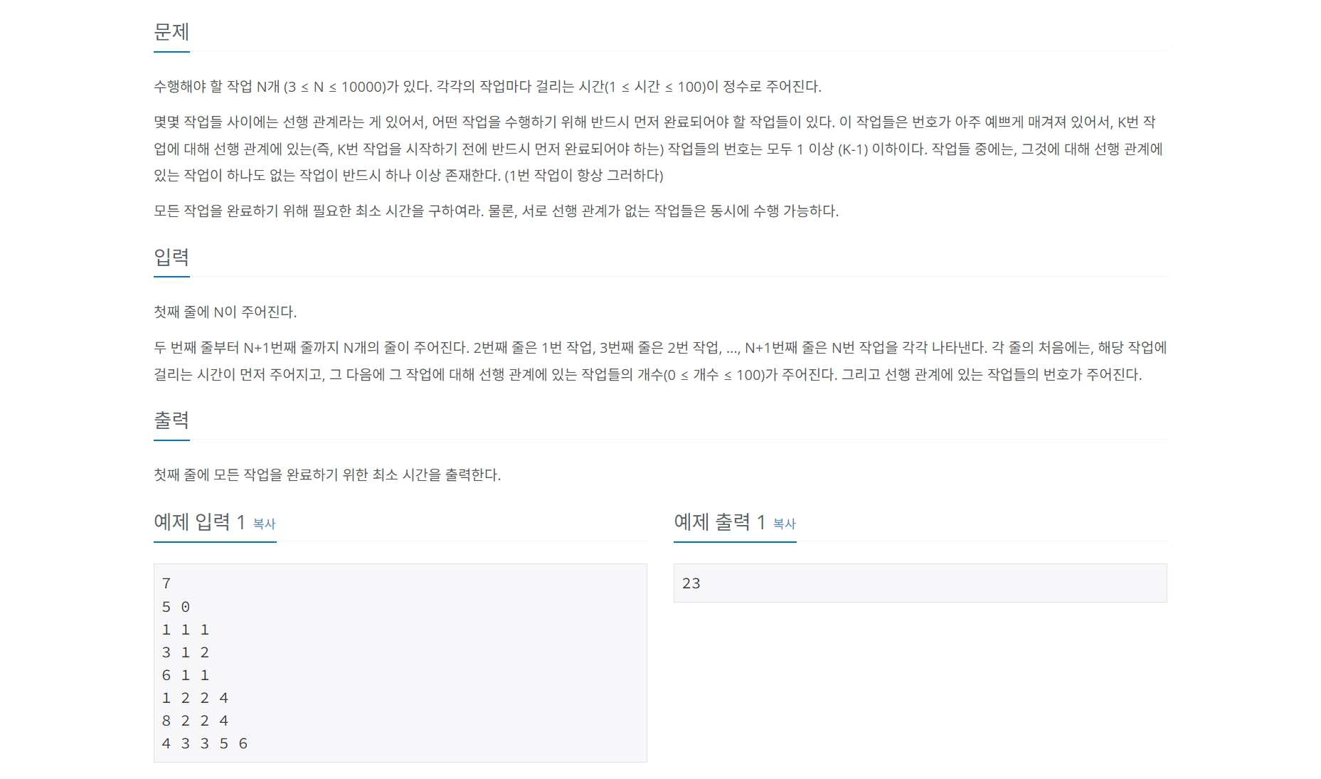 수행해야 할 작업 N개 (3 ≤ N ≤ 10000)가 있다. 각각의 작업마다 걸리는 시간(1 ≤ 시간 ≤ 100)이 정수로 주어진다. 몇몇 작업들 사이에는 선행 관계라는 게 있어서, 어떤 작업을 수행하기 위해