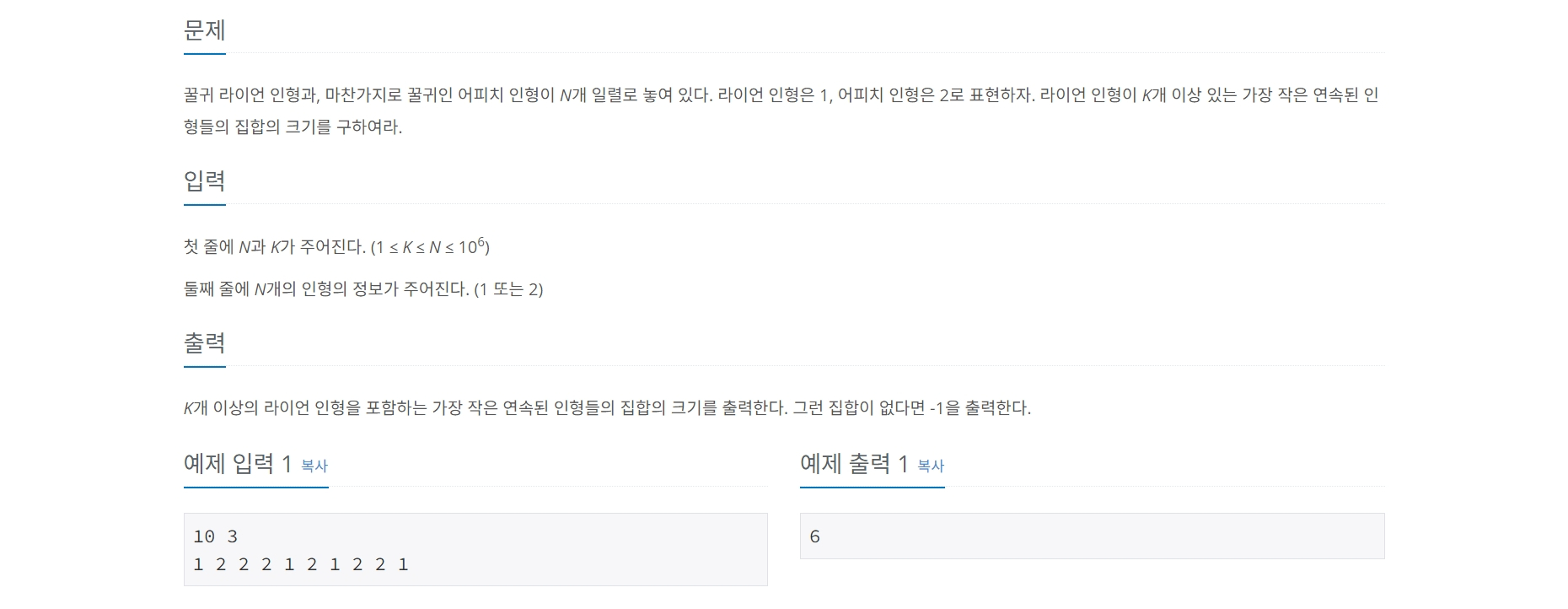 꿀귀 라이언 인형과, 마찬가지로 꿀귀인 어피치 인형이 N개 일렬로 놓여 있다. 라이언 인형은 1, 어피치 인형은 2로 표현하자. 라이언 인형이 K개 이상 있는 가장 작은 연속된 인형들의 집합의