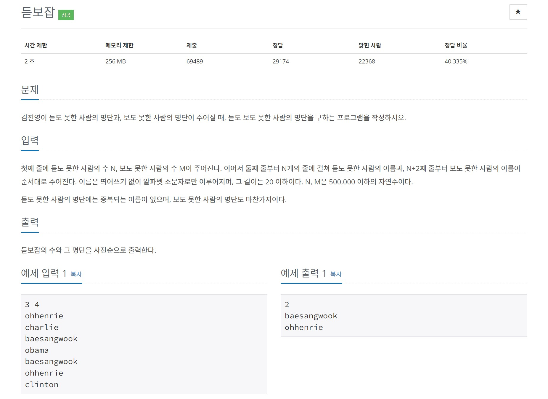 첫째 줄에 듣도 못한 사람의 수 N, 보도 못한 사람의 수 M이 주어진다. 이어서 둘째 줄부터 N개의 줄에 걸쳐 듣도 못한 사람의 이름과, N+2째 줄부터 보도 못한 사람의 이름이 순서대로 주어진다.
