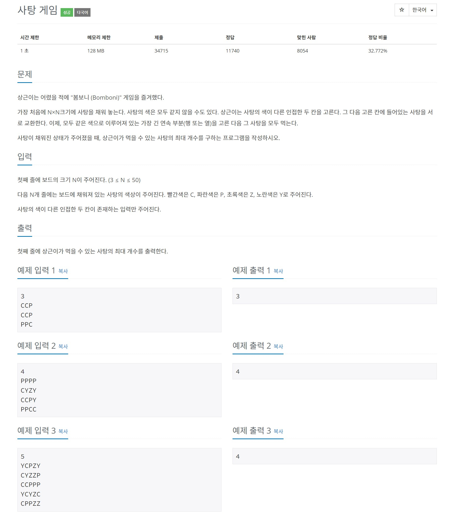 인접한 사탕이 다른 색일 경우 바꾸면서 최댓값을 찾는다.