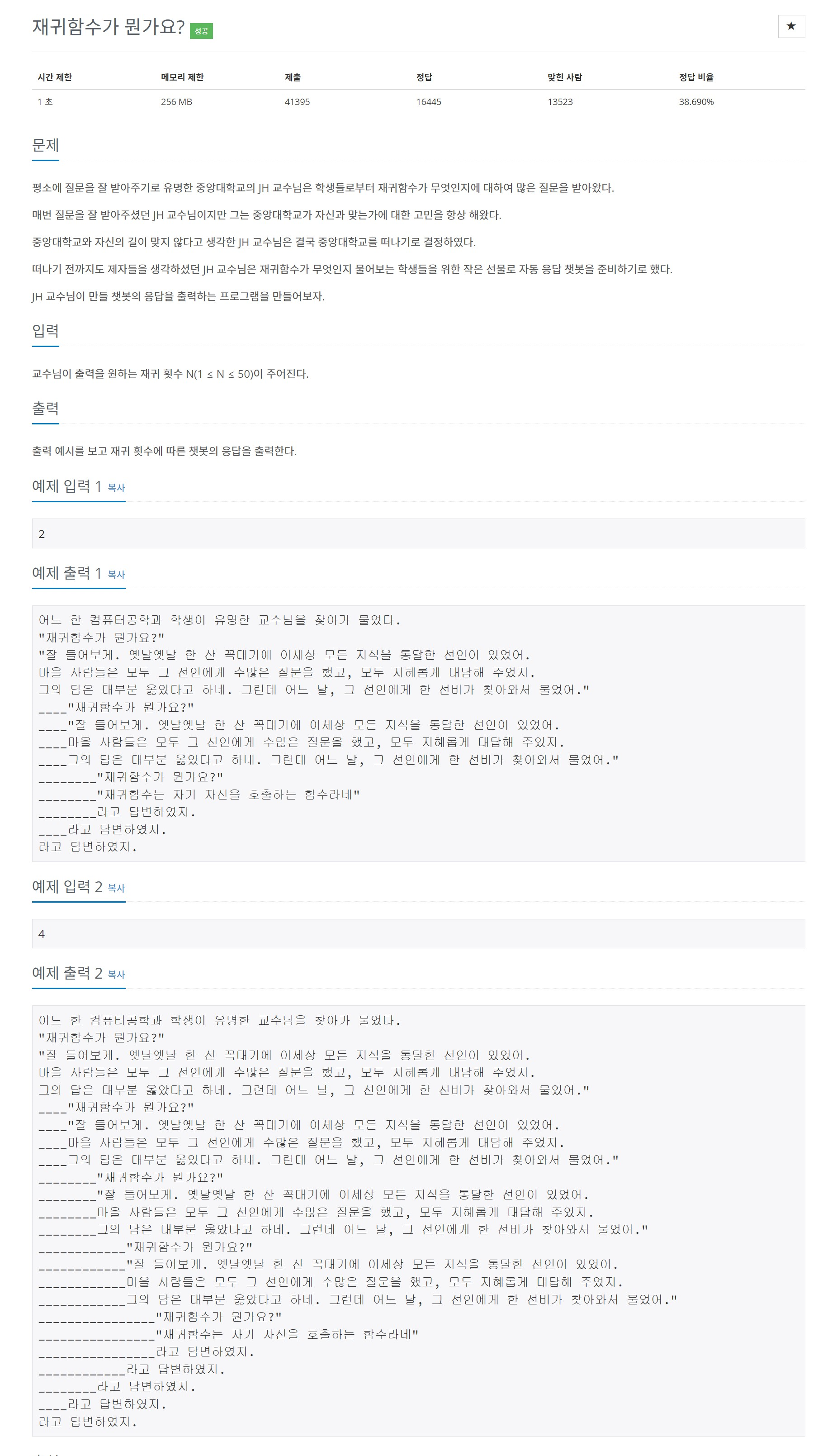 평소에 질문을 잘 받아주기로 유명한 중앙대학교의 JH 교수님은 학생들로부터 재귀함수가 무엇인지에 대하여 많은 질문을 받아왔다. 매번 질문을 잘 받아주셨던 JH 교수님이지만 그는 중앙대