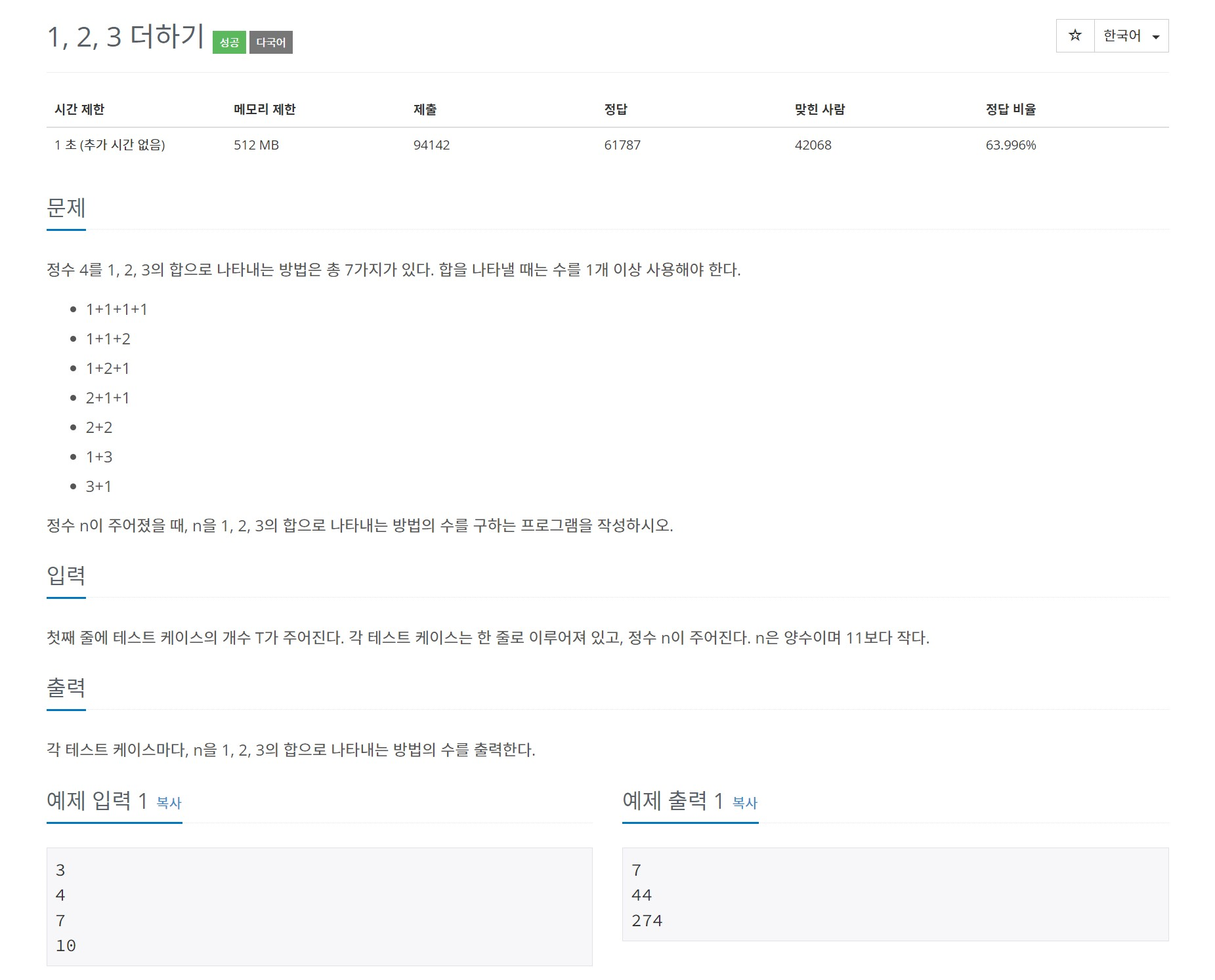 9095번: 1, 2, 3 더하기