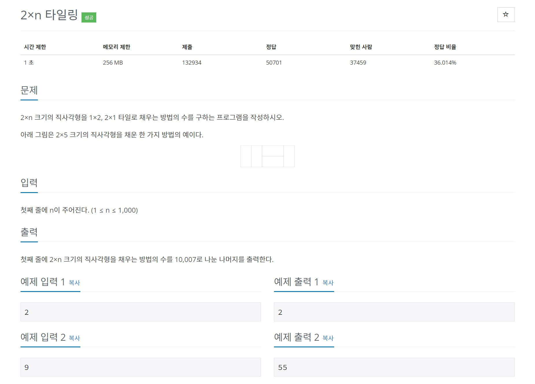 2×n 크기의 직사각형을 1×2, 2×1 타일로 채우는 방법의 수를 구하는 프로그램을 작성하시오. 아래 그림은 2×5 크기의 직사각형을 채운 한 가지 방법의 예이다.