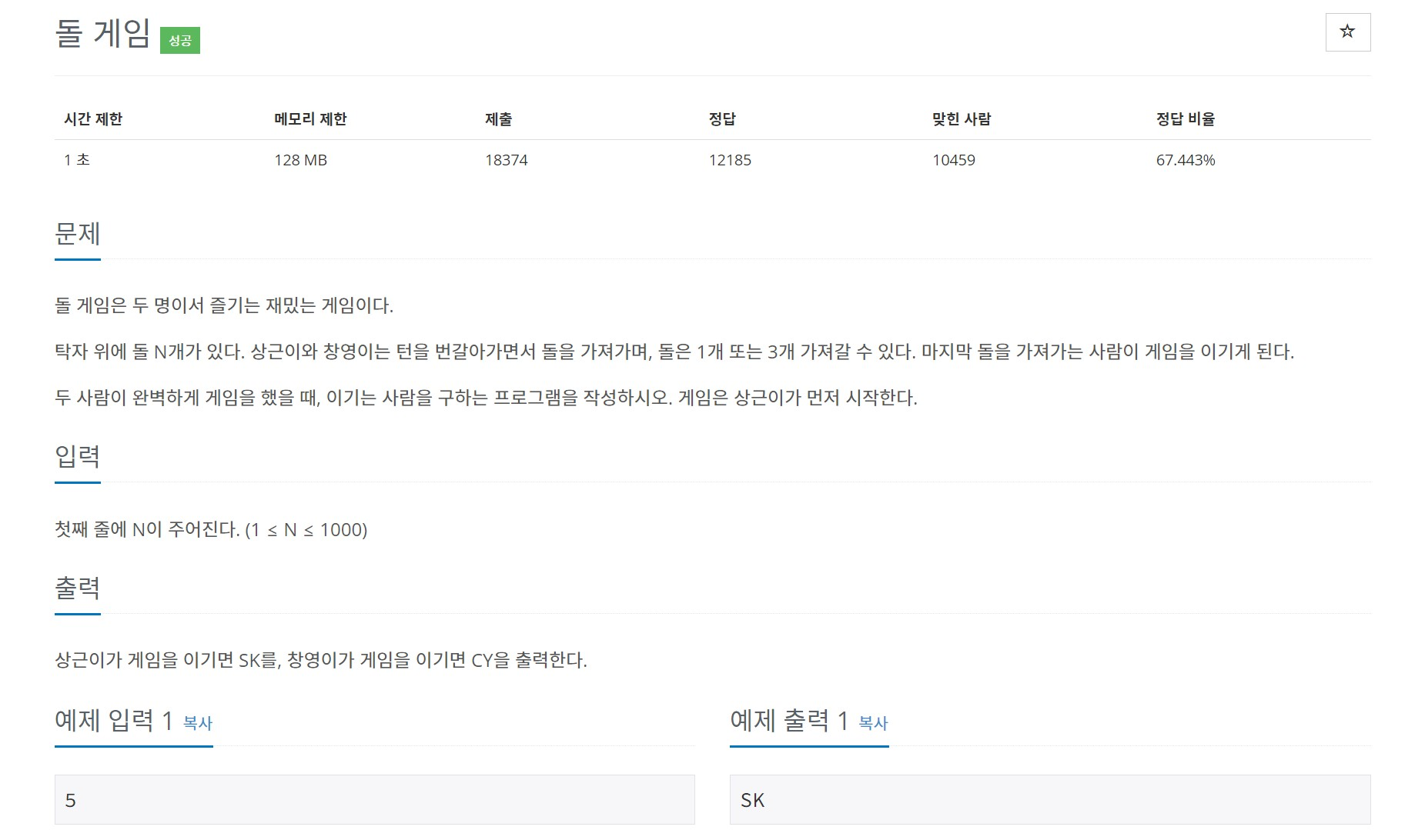 문제에서 시작이 상근이라는 것과 1개 또는 3개의 돌만 가져갈 수 있다는 점에 주목했다.