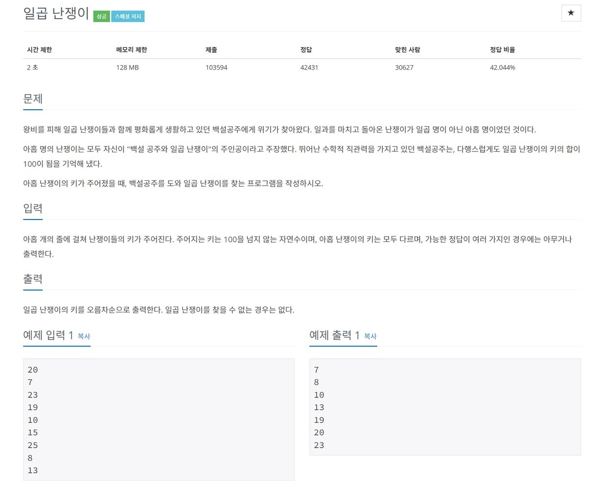 2309번: 일곱 난쟁이