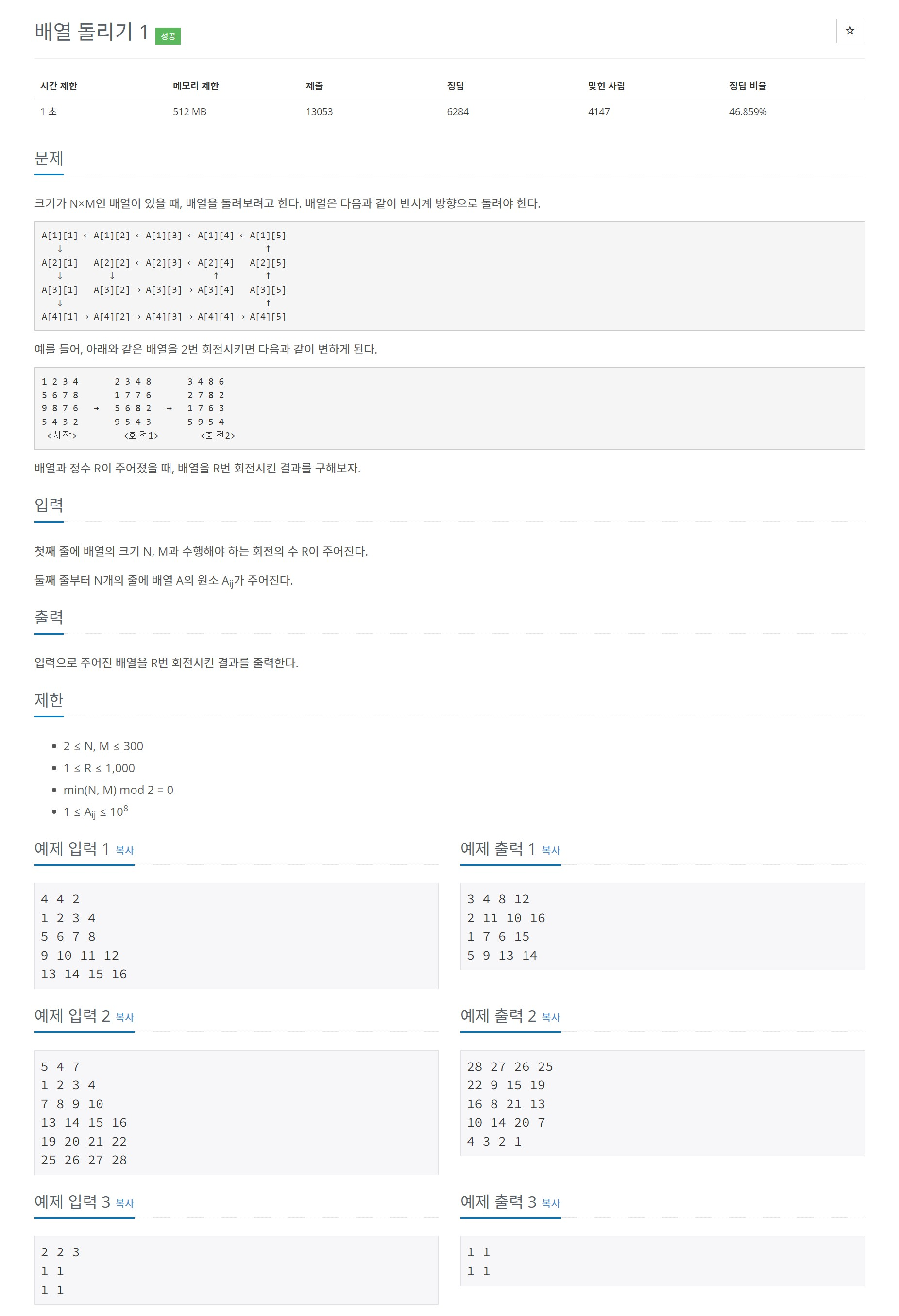크기가 N×M인 배열이 있을 때, 배열을 돌려보려고 한다. 배열은 다음과 같이 반시계 방향으로 돌려야 한다. A[1][1] ← A[1][2] ← A[1][3] ← A[1][4] ← A[1][5] ↓ ↑ A[2][1] A[2][2] ← A[2][3] ← A[2][4] A[2][5]