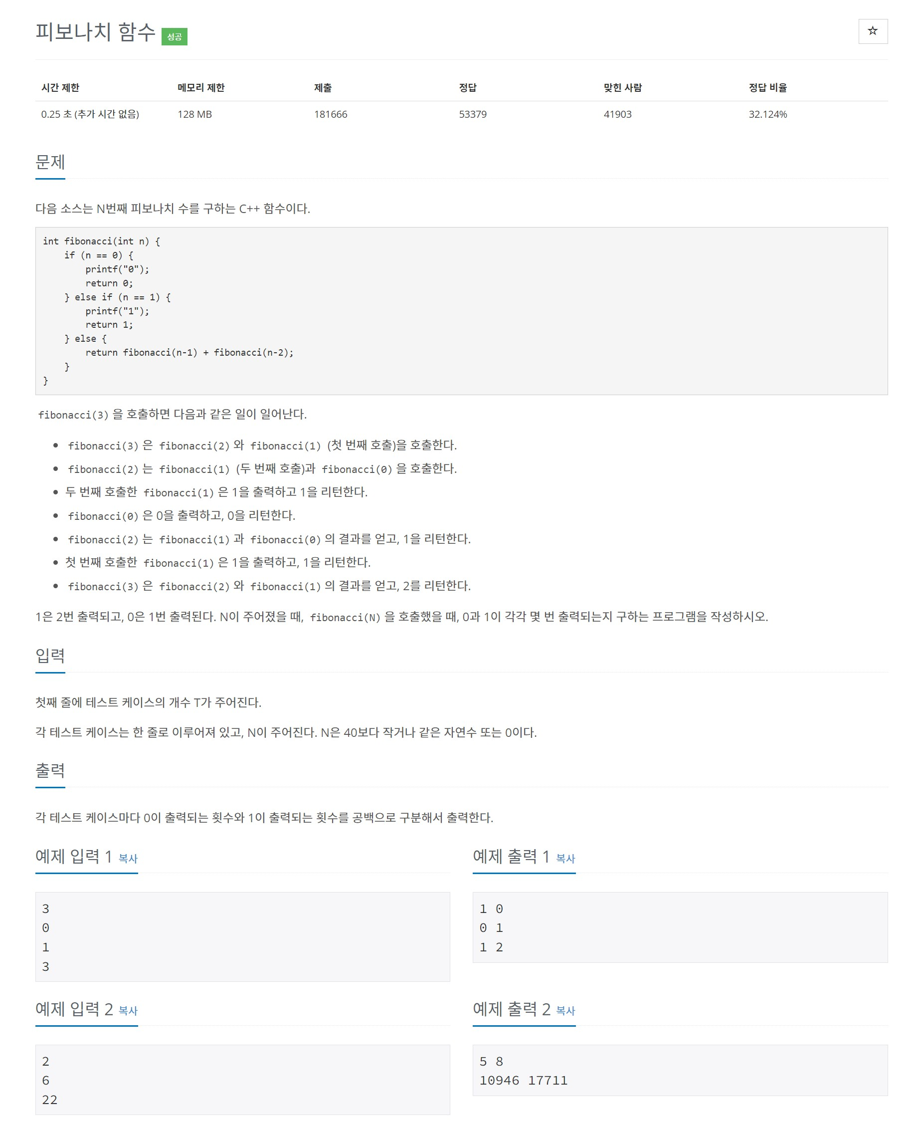 N번째 피보나치 수를 구하는 과정에서 1번째 피보나치 수와 0번째 피보나치 수가 몇 번 호출되었는지를 구하는 문제이다.