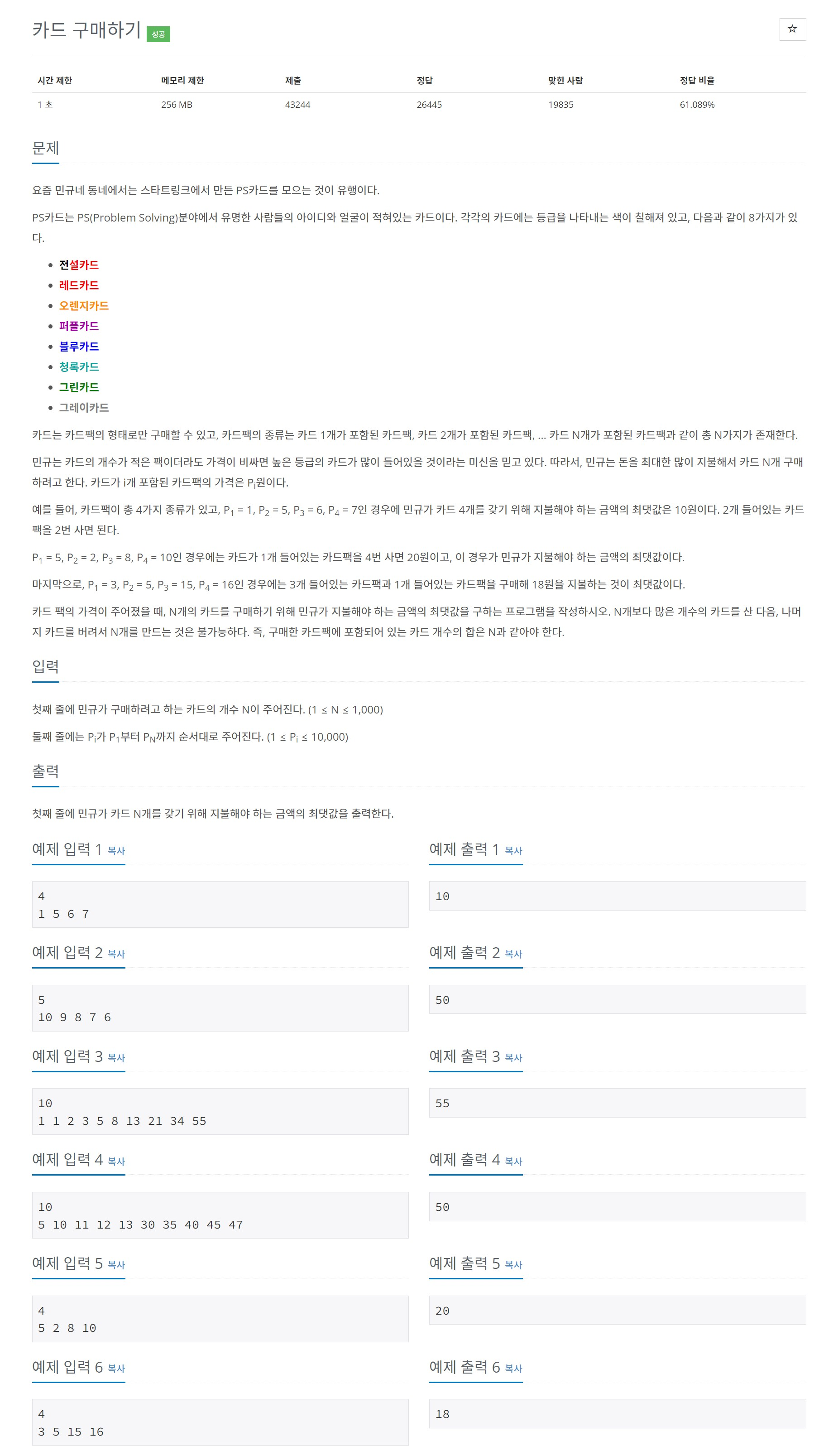 N개의 카드를 제일 비싸게 샀을 때의 가격을 구하는 문제이다.