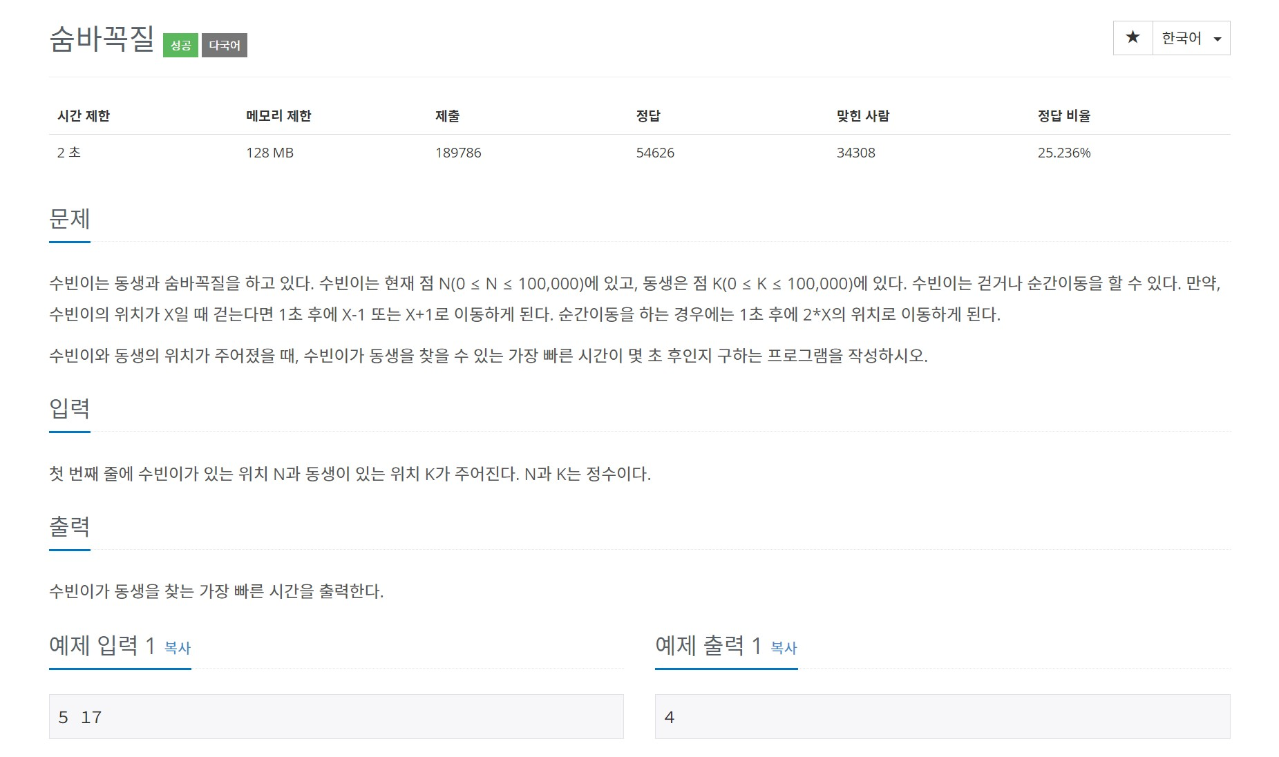 수빈이는 동생과 숨바꼭질을 하고 있다. 수빈이는 현재 점 N(0 ≤ N ≤ 100,000)에 있고, 동생은 점 K(0 ≤ K ≤ 100,000)에 있다. 수빈이는 걷거나 순간이동을 할 수 있다. 만약, 수빈이의 위치가 X일