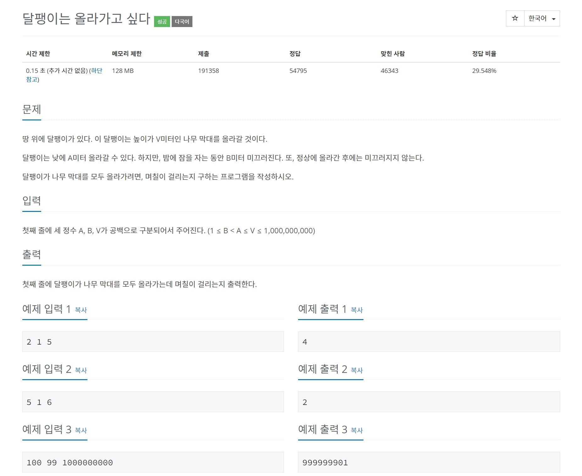 첫째 줄에 세 정수 A, B, V가 공백으로 구분되어서 주어진다. (1 ≤ B < A ≤ V ≤ 1,000,000,000)