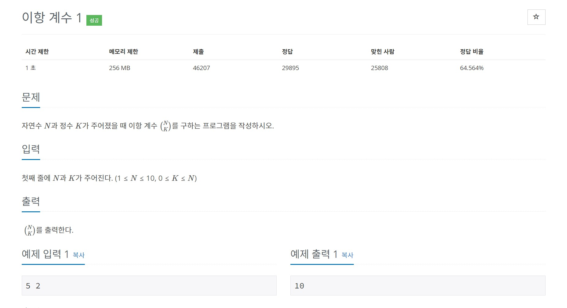 이항계수를 구하는 공식은 n! / (k! * (n-k)!)이다.