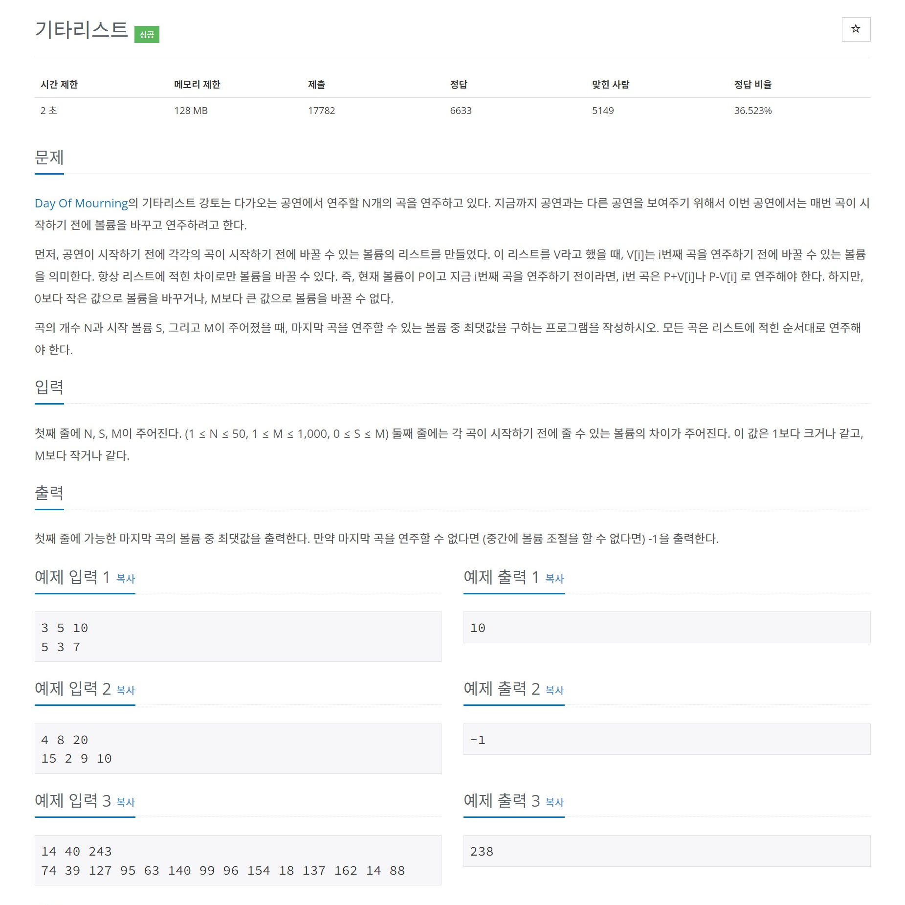 첫째 줄에 N, S, M이 주어진다. (1 ≤ N ≤ 50, 1 ≤ M ≤ 1,000, 0 ≤ S ≤ M) 둘째 줄에는 각 곡이 시작하기 전에 줄 수 있는 볼륨의 차이가 주어진다. 이 값은 1보다 크거나 같고, M보다 작거나 같다.