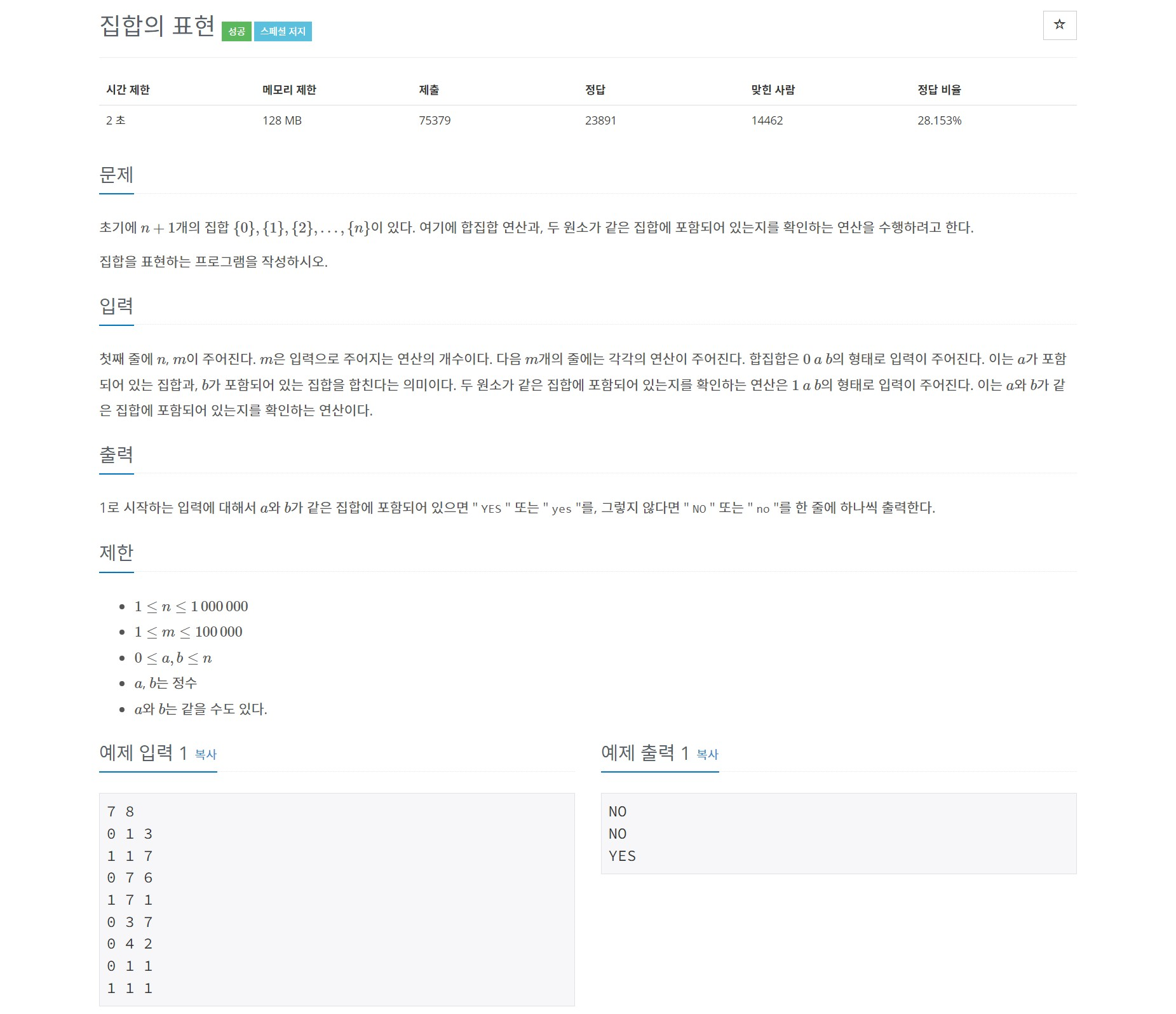 초기에 $n+1$개의 집합 $\{0\}, \{1\}, \{2\}, \dots , \{n\}$이 있다. 여기에 합집합 연산과, 두 원소가 같은 집합에 포함되어 있는지를 확인하는 연산을 수행하려고 한다. 집합을 표현하는 프로그램을 작