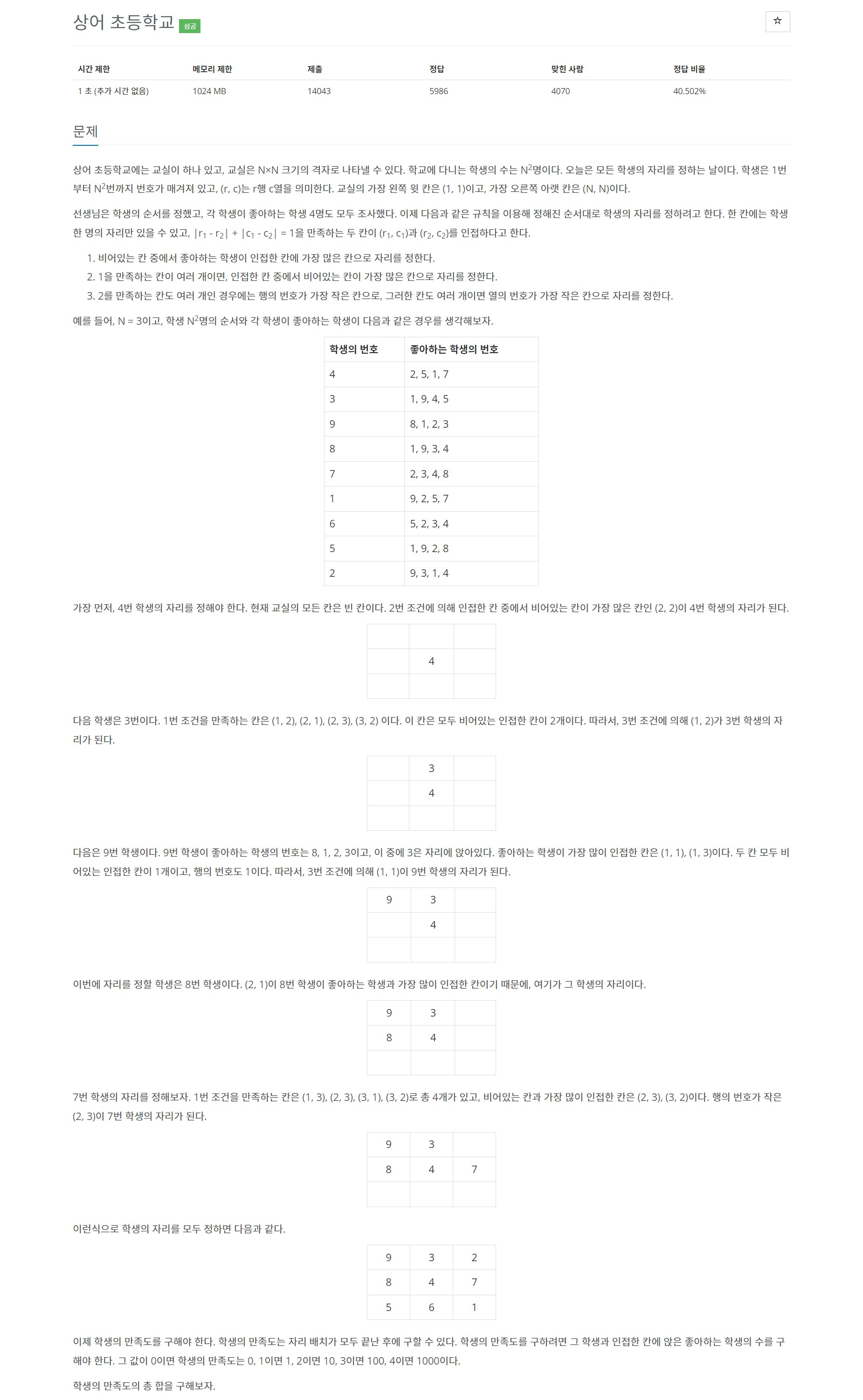 상어 초등학교에는 교실이 하나 있고, 교실은 N×N 크기의 격자로 나타낼 수 있다. 학교에 다니는 학생의 수는 N2명이다. 오늘은 모든 학생의 자리를 정하는 날이다. 학생은 1번부터 N2번까지 번호