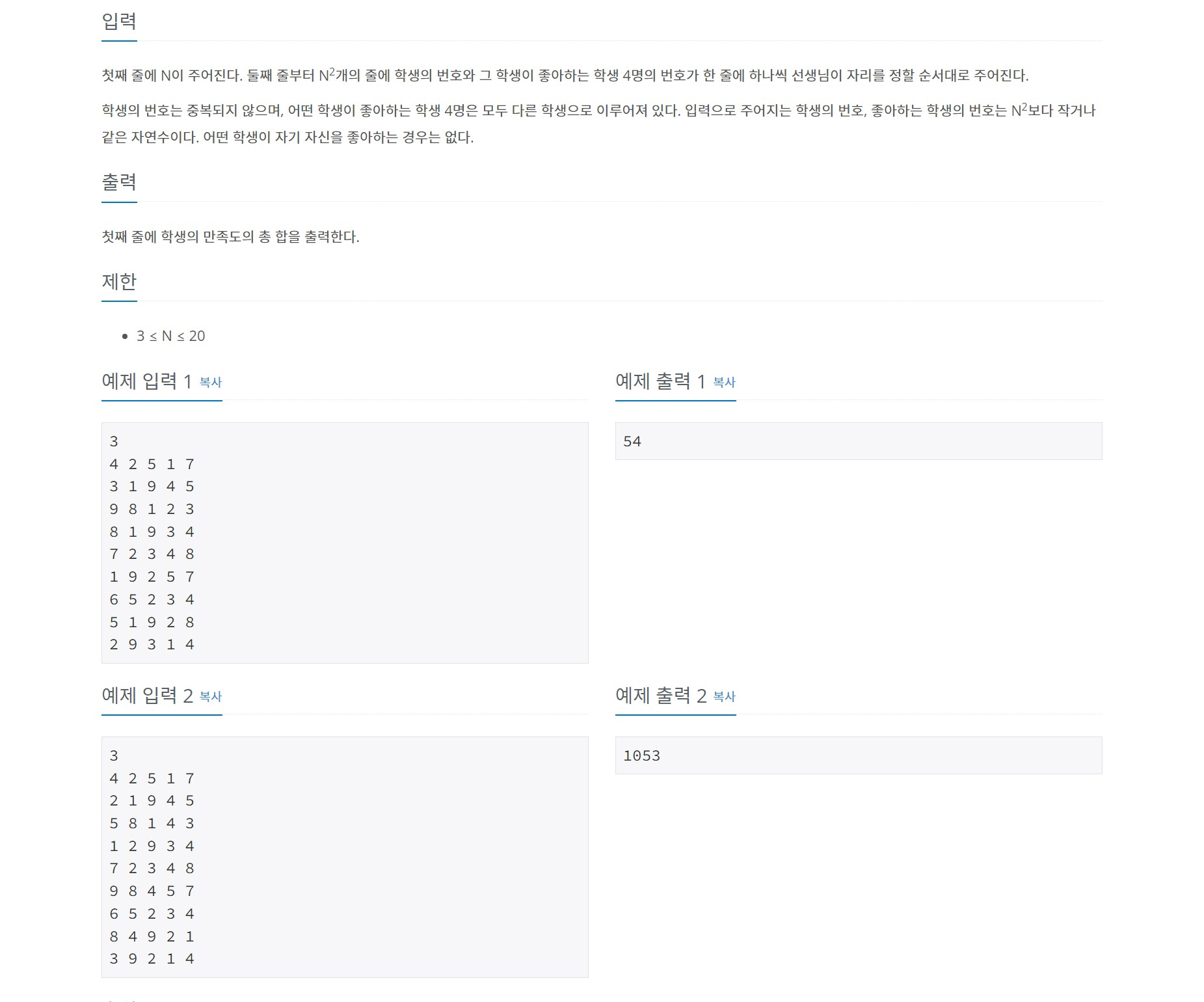 4-2. 3번 조건은 탐색 순서 때문에 자연스럽게 순서대로 들어가서 list2의 0번째 인덱스로 정한다. - 모든 학생에 대한 자리 배치가 끝나면 사방 탐색으로 인접한 좋아하는 학생 수를 구해 만족도를 구한다.