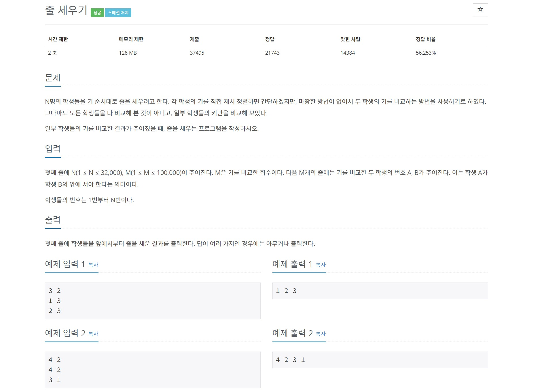 - 두 학생의 키를 비교해 전체 학생을 줄 세우는 위상정렬 문제이다.