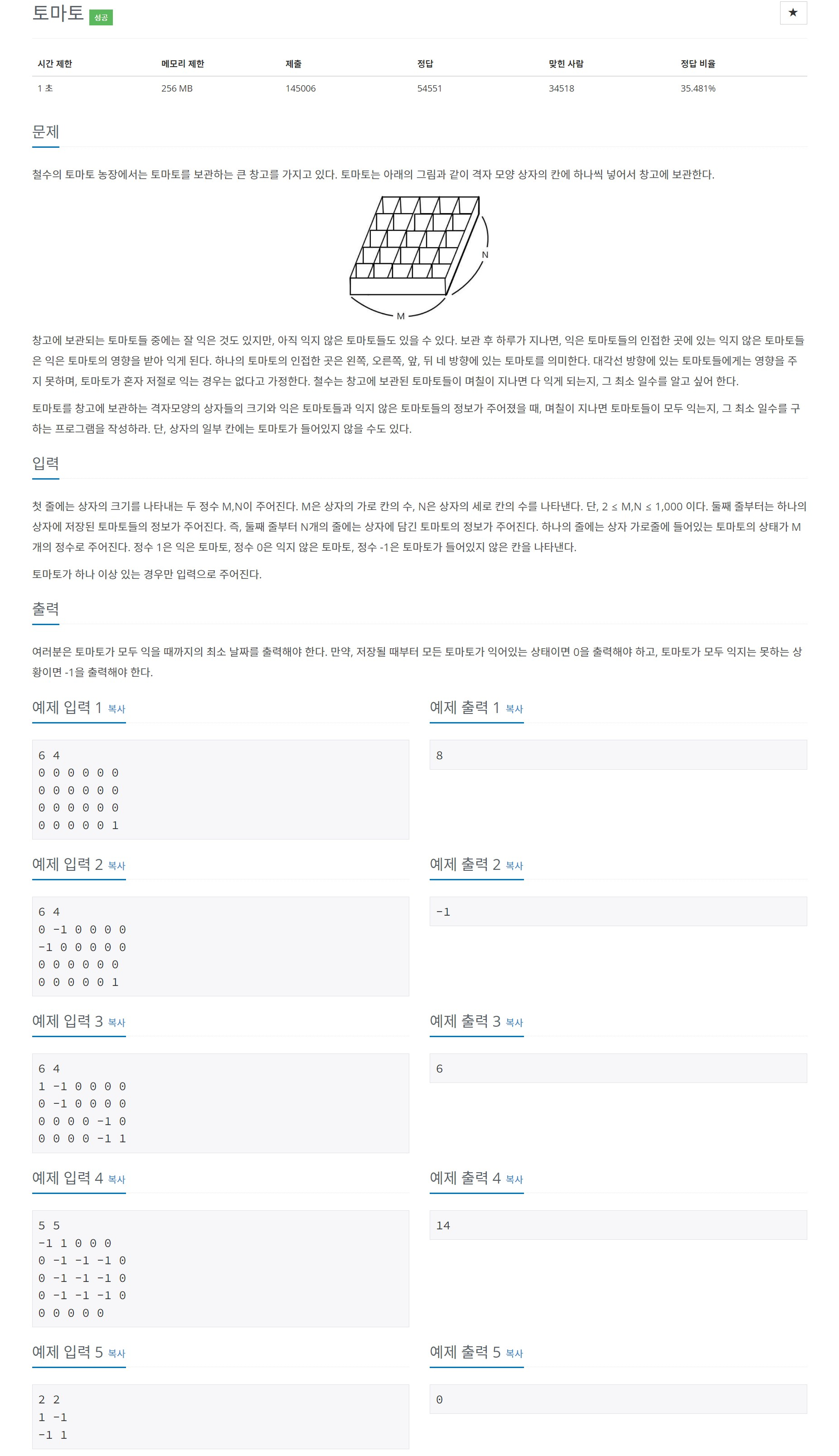 첫 줄에는 상자의 크기를 나타내는 두 정수 M,N이 주어진다. M은 상자의 가로 칸의 수, N은 상자의 세로 칸의 수를 나타낸다. 단, 2 ≤ M,N ≤ 1,000 이다. 둘째 줄부터는 하나의 상자에 저장된 토마토