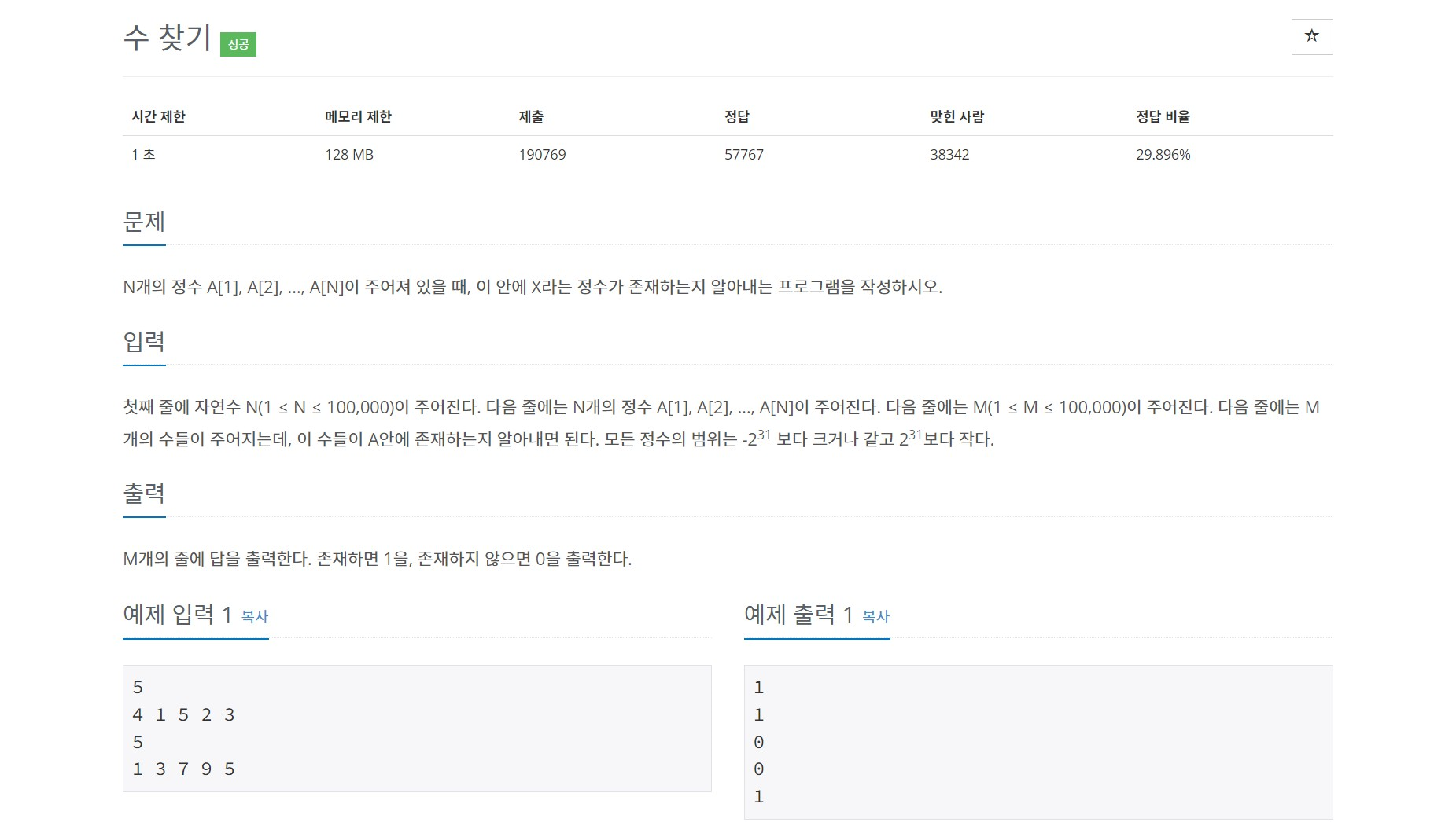 첫째 줄에 자연수 N(1 ≤ N ≤ 100,000)이 주어진다. 다음 줄에는 N개의 정수 A[1], A[2], …, A[N]이 주어진다. 다음 줄에는 M(1 ≤ M ≤ 100,000)이 주어진다. 다음 줄에는 M개의 수들이 주어지는데, 이 수들